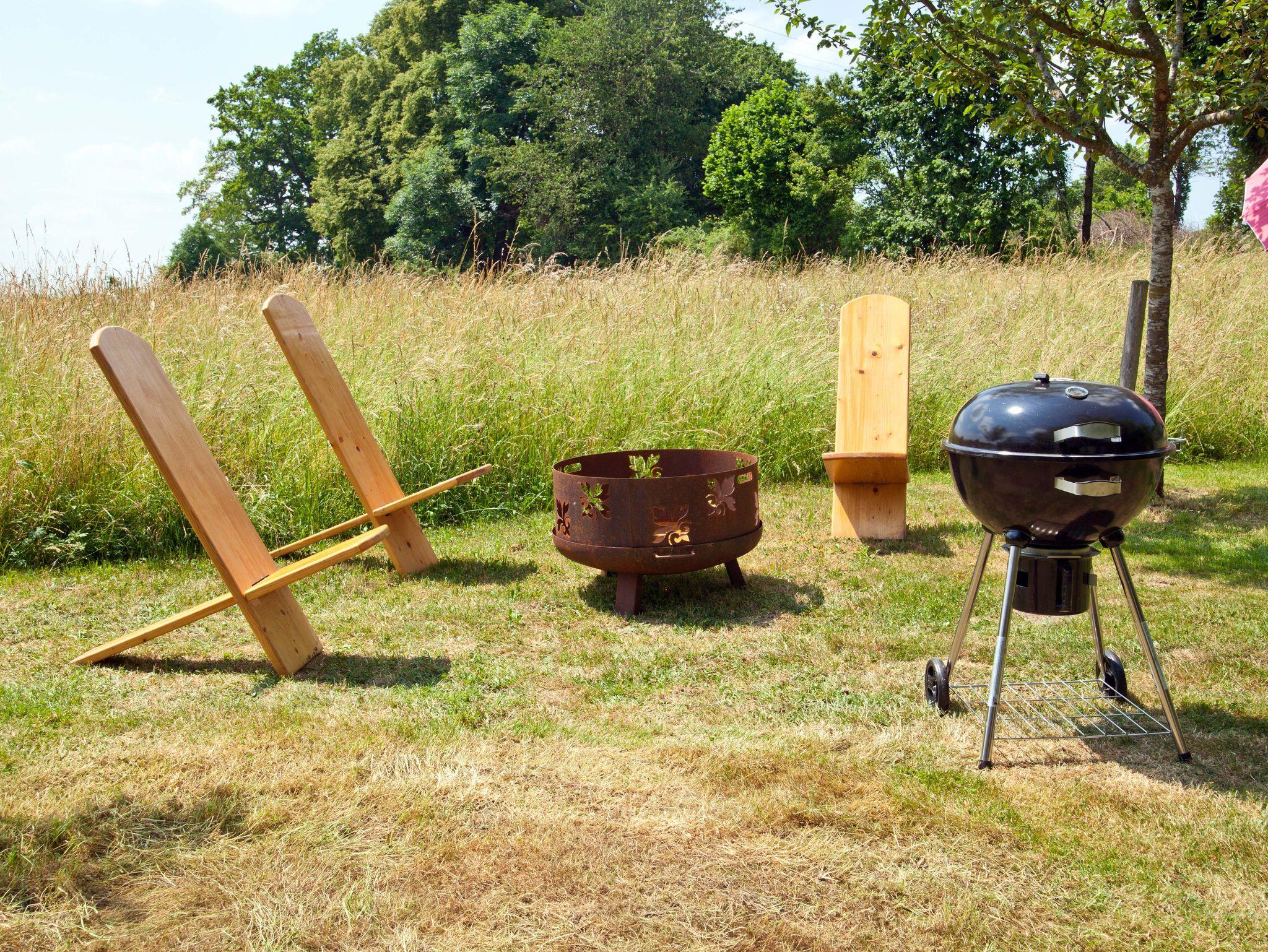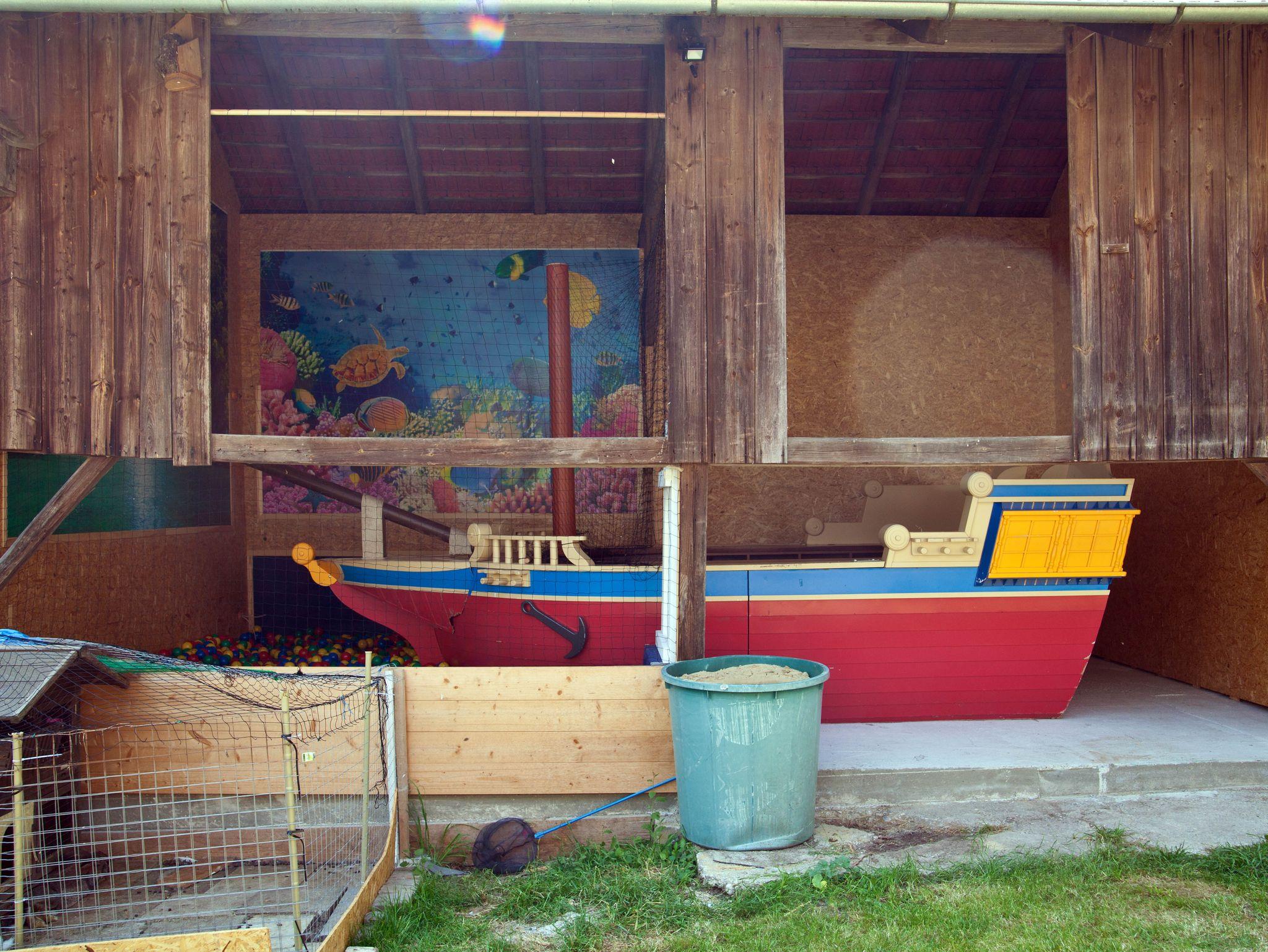 Blick in die Berge, den Obstanger und den Gästegarten mit Spielplatz .