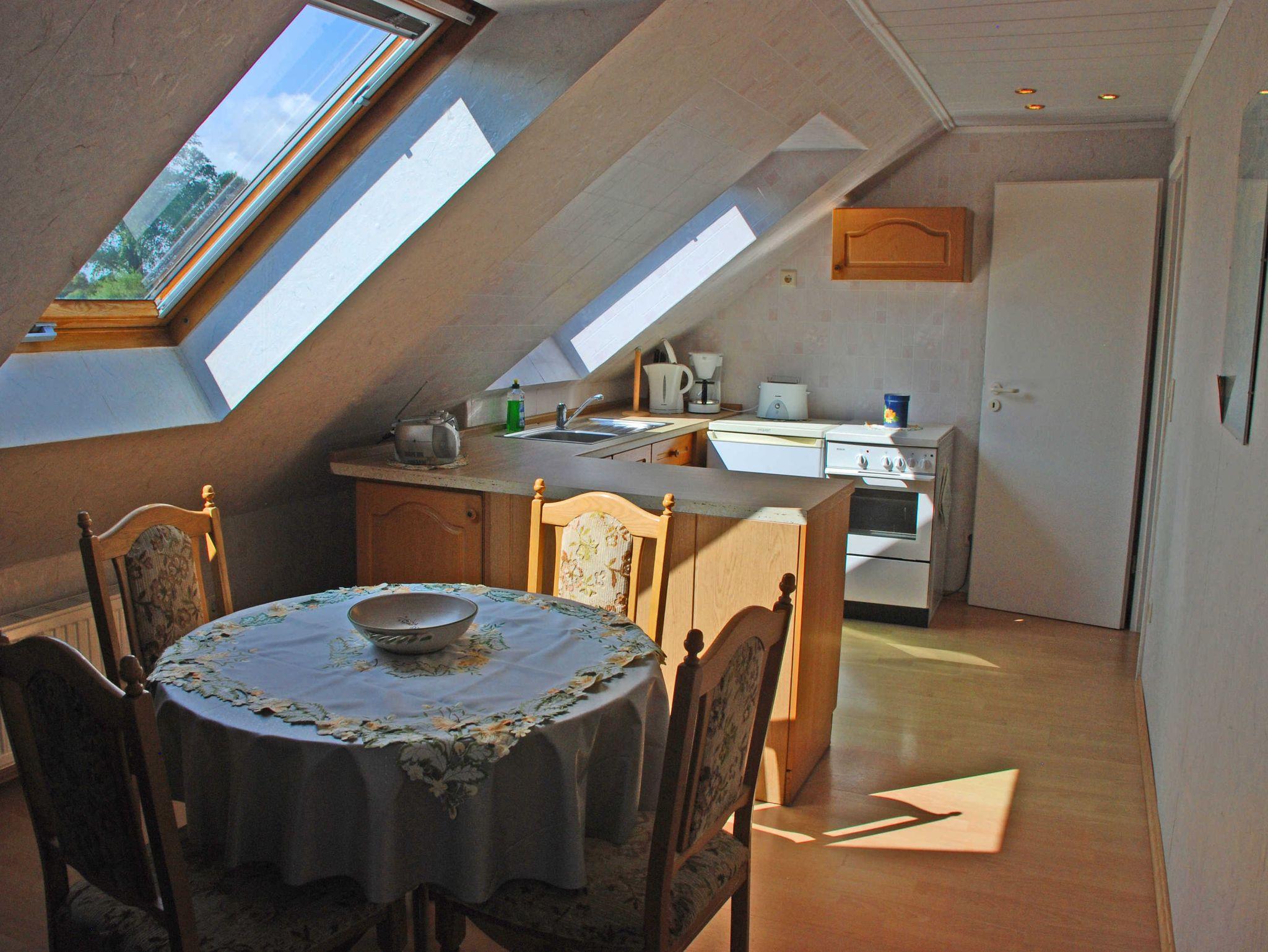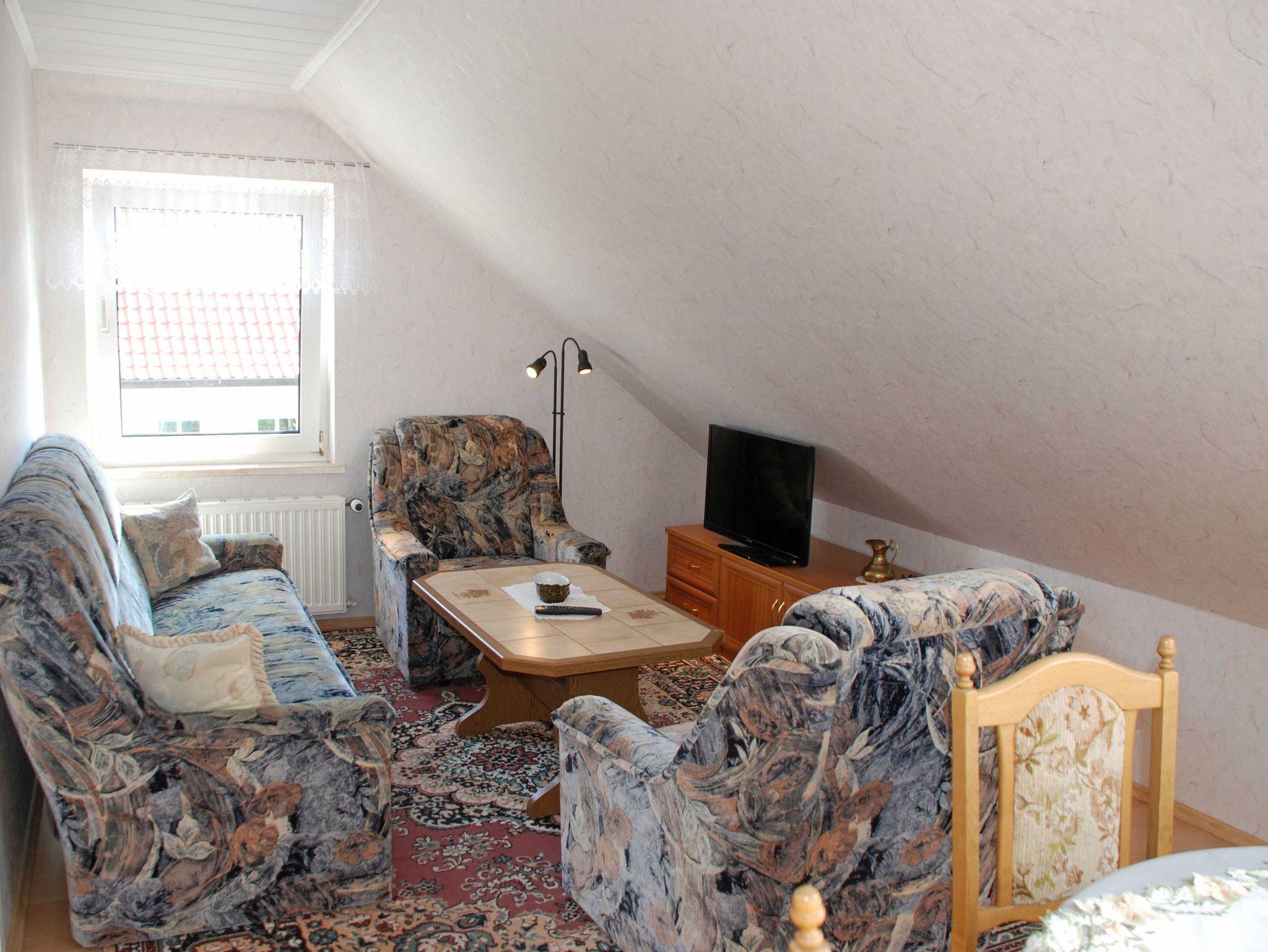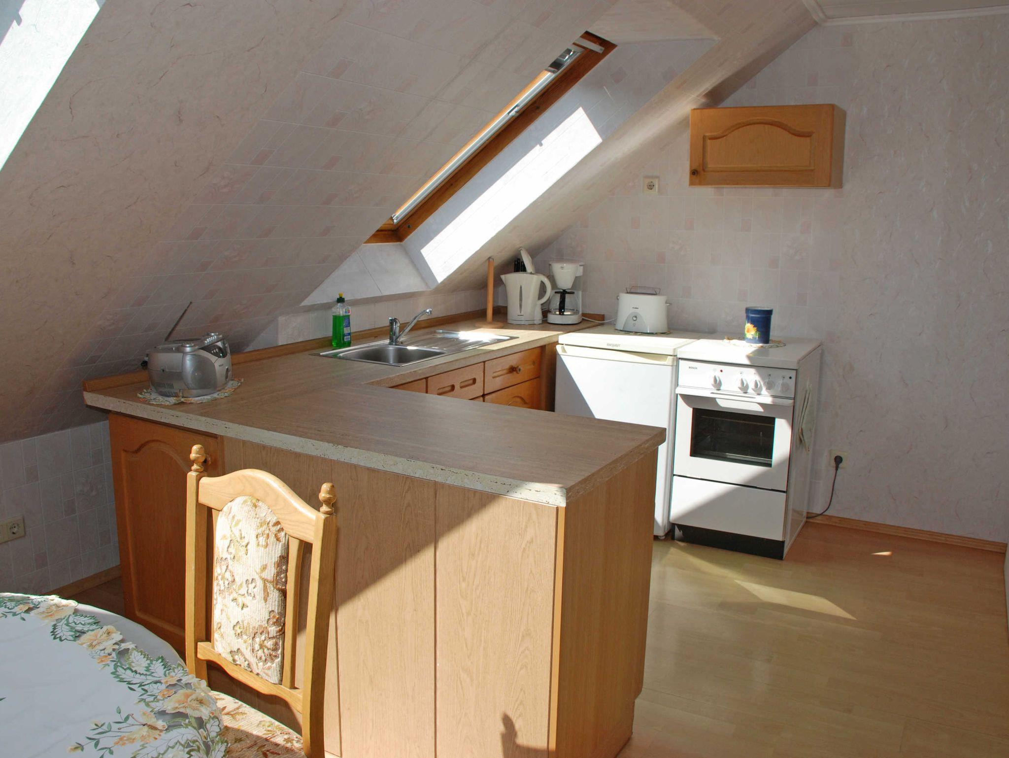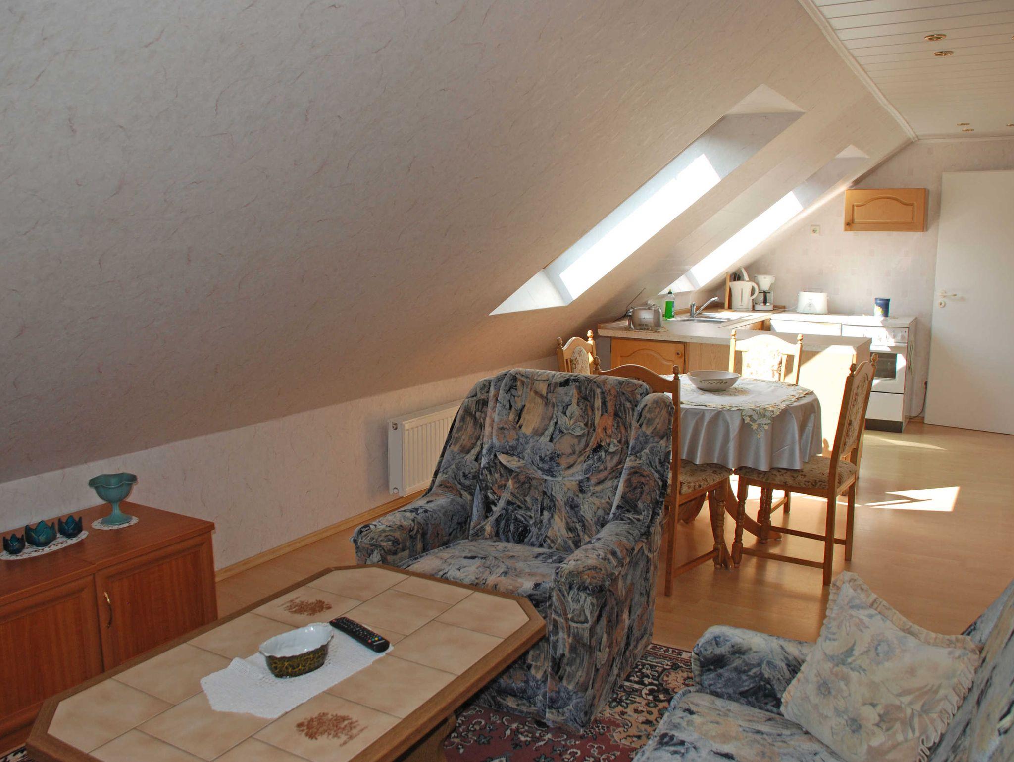 Unsere Ferienwohnung mit Terrasse und Aussicht ist ca. 70 qm groß, hat Platz für maximal 5 Gäste und wurde sehr liebevoll und modern eingerichtet. Über eine Außentreppe gelangt man zum separaten Eingang im Obergeschoss. In dem großzügigen Wohnraum befinden sich eine Sitzcouch mit Tisch und Sessel, Leselampe, TV-Gerät sowie eine Musikanlage. Hier steht auch ein Esstisch mit Stühlen. Für einen weiteren Gast kann bei Bedarf die Sitzcouch aufgebettet werden. Die Küchenzeile im Wohnbereich ist mit einem Herd, Backofen, Wasserkocher, Kaffeemaschine, Toaster und Kühlschrank komplett ausgestattet.