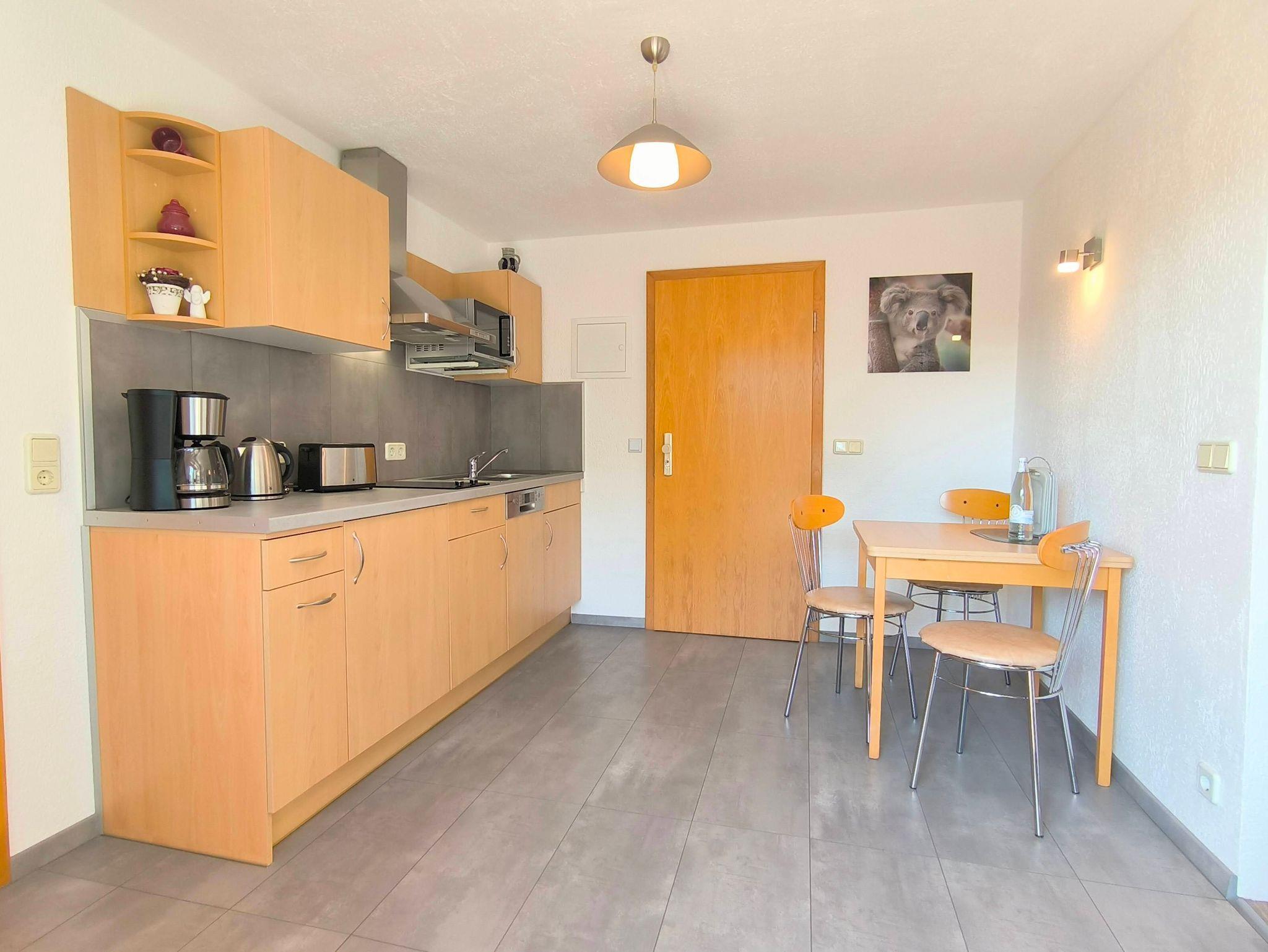 Einer Küche mit kleinem Esstisch und Stühlen, Geschirrspüler, Kühlschrank, Herd, Mikrowelle mit Grill und Umluft, Kaffeemaschine, Wasserkocher, Toaster, Besteck und Geschirr und einen wunderschönen Blick auf die Terrasse.