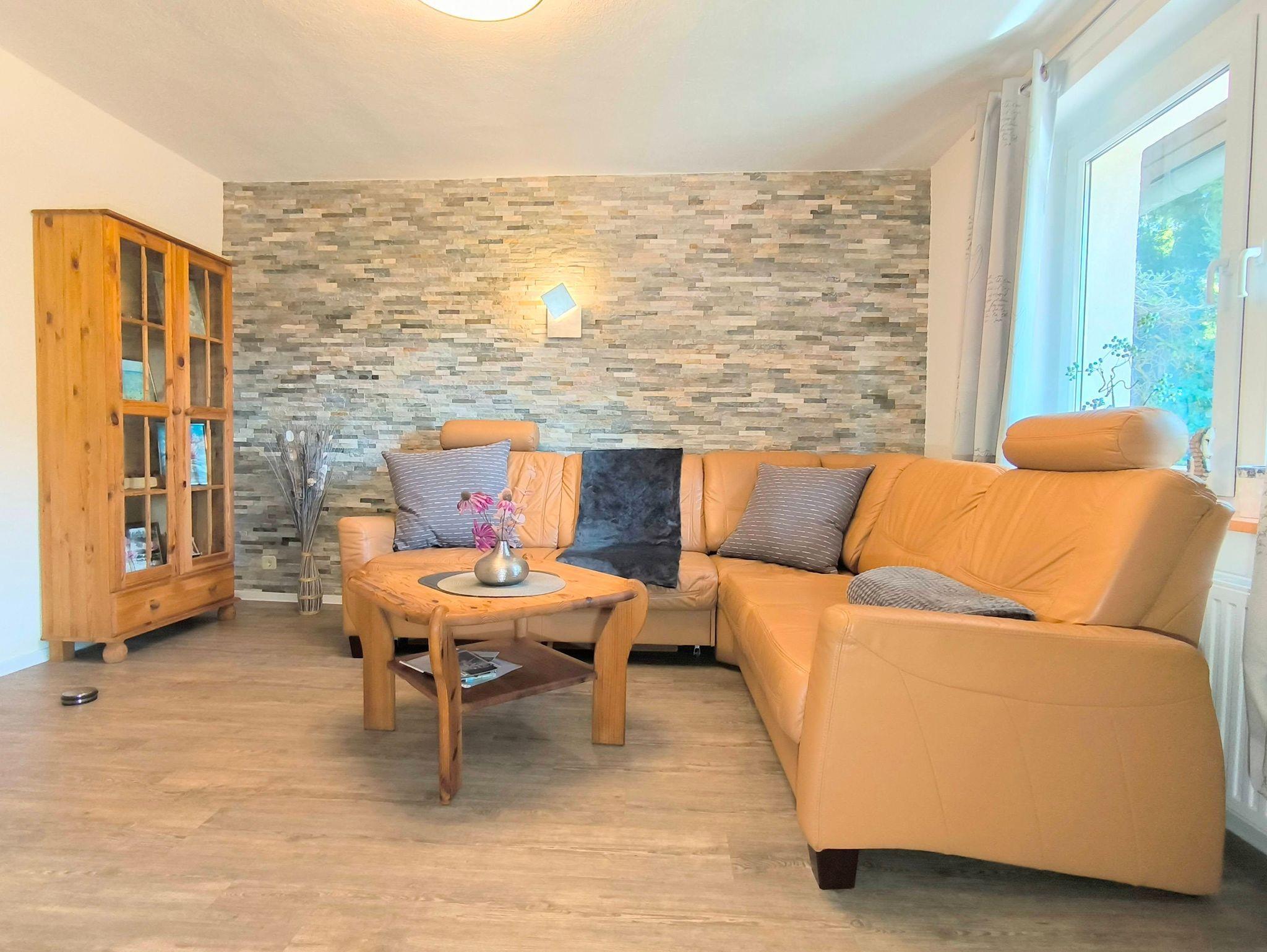 Einem Wohnzimmer mit bequemer, ausziehbare Couchgarnitur und Holzmöbeln sowie SAT-TV, CD-Player und Radio.