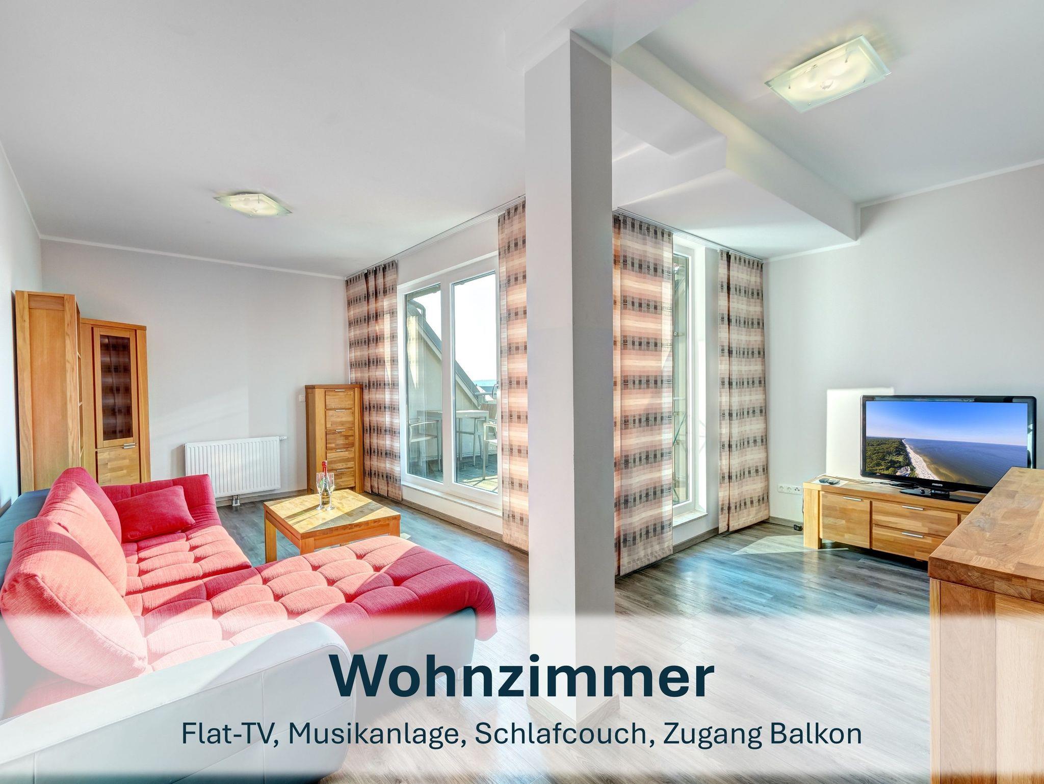 Für Paare oder Einzelreisende bietet die Wohnung „Jolle 16“ im Obergeschoss eine charmante Rückzugsmöglichkeit auf 43m². Der kombinierte Wohn- und Schlafbereich, eine kleine Küche und der möblierte Balkon schaffen eine gemütliche Atmosphäre für entspannte Tage.