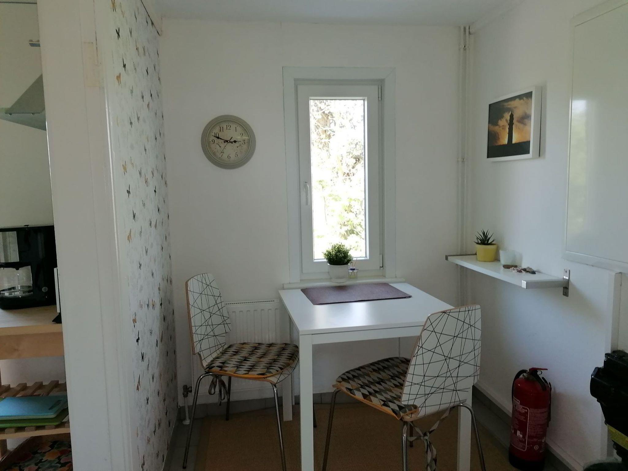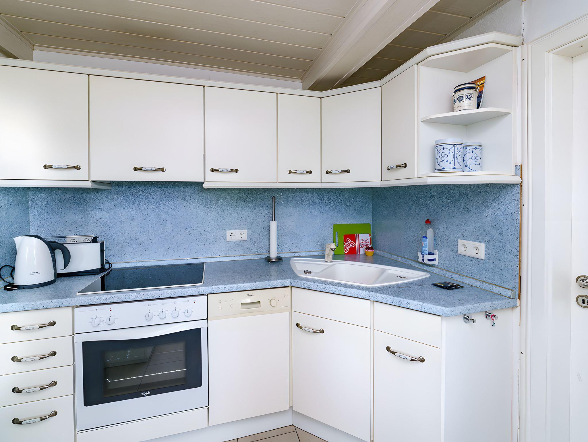 Die kleine Einbauküche bietet alles, was Sie für den täglichen Gebrauch zum Kochen und Essen benötigen. Kaffeemaschine, Toaster, Wasserkocher, Mixer und eine Spülmaschine sind vorhanden. In der Diele befindet sich ein zusätzlicher Sitzplatz für eine kleine Mahlzeit zwischendurch.