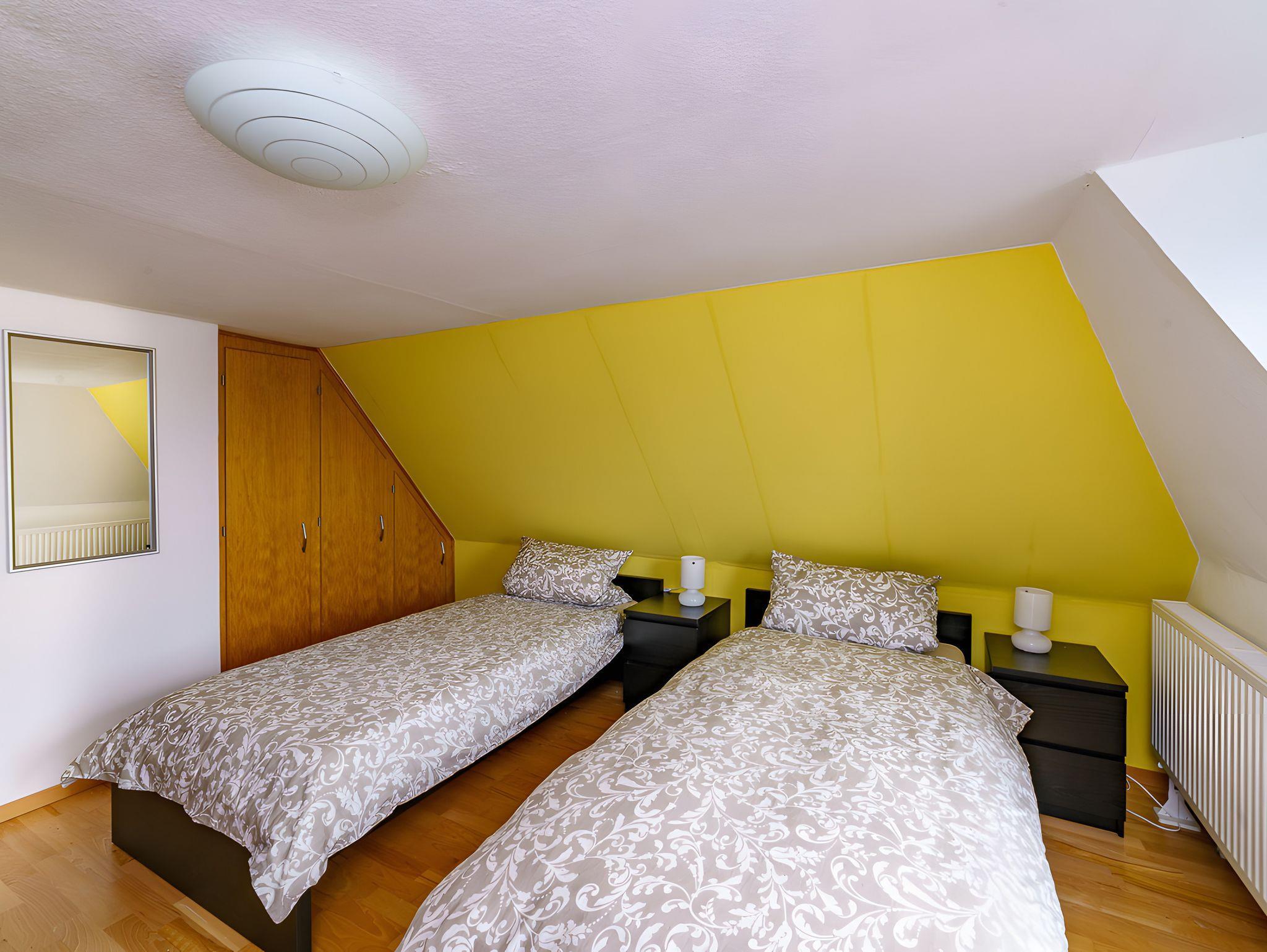 Das Schlafzimmer im Erdgeschoss ist mit einem Doppelbett, einem Kleiderschrank, einem Spiegel und Ablagemöglichkeiten ausgestattet.