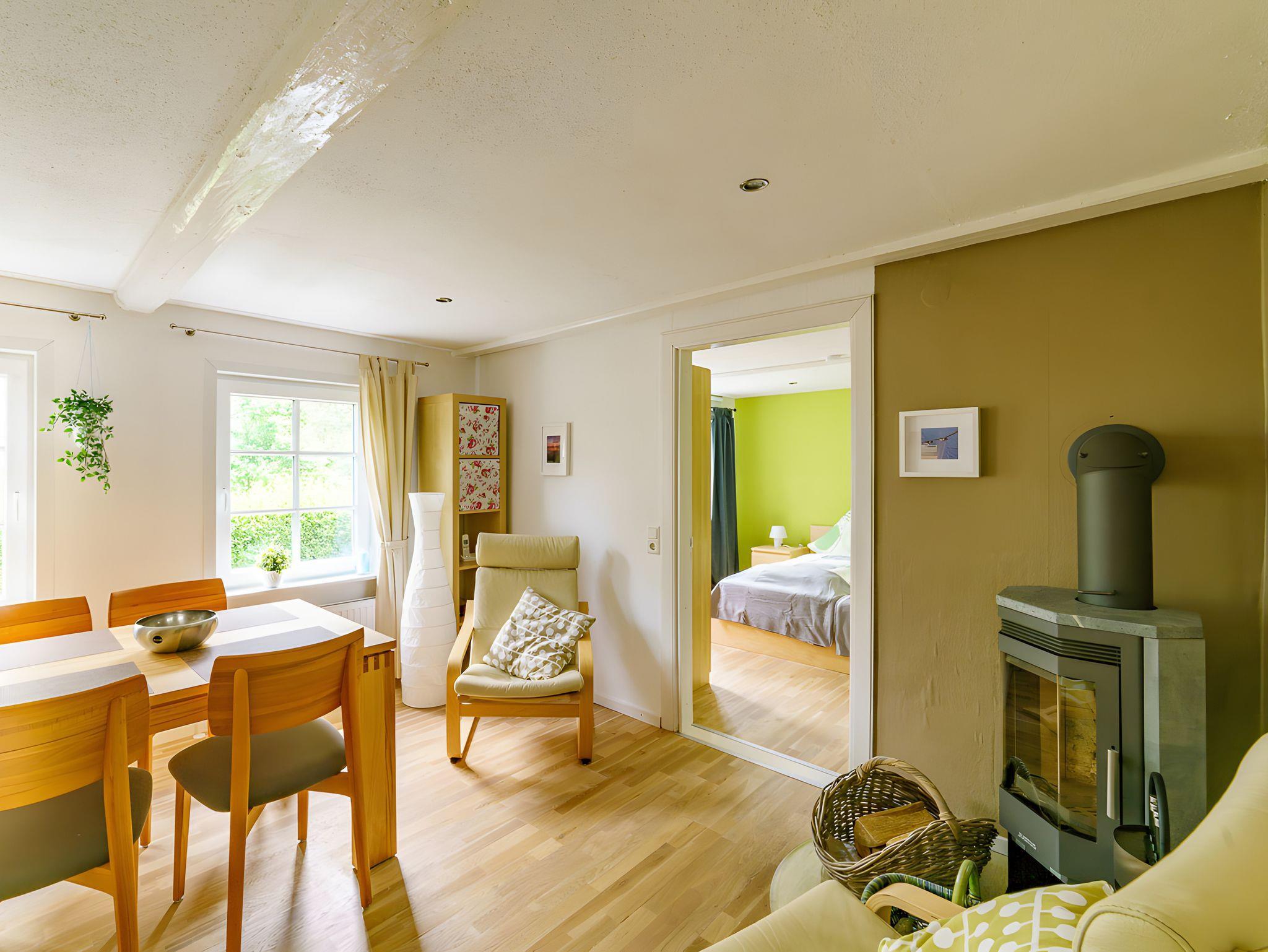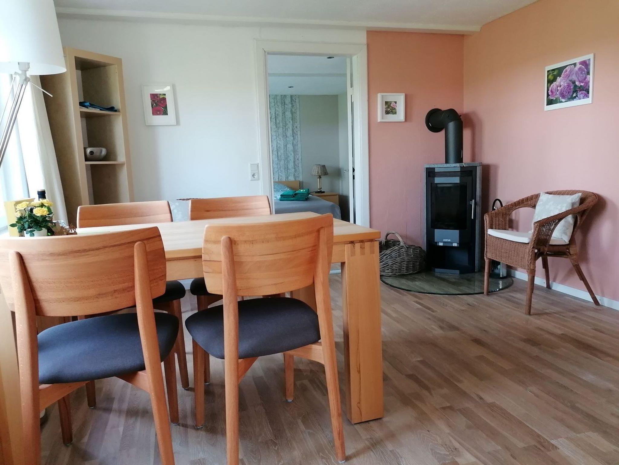 Im Erdgeschoss befinden sich ein Flur mit Garderobe und Schuhschrank sowie ein gemütliches Wohnzimmer mit Sofagarnitur, Flachbild-TV, Musikanlage und DVD-Player. Eine Auswahl an Büchern und DVDs steht zur Verfügung. Es gibt ausreichend Leselampen und Platz für einen Laptop. Im Esszimmer finden Sie einen großen Esstisch für bis zu 6 Personen sowie zwei gemütliche Sessel vor dem Kaminofen.