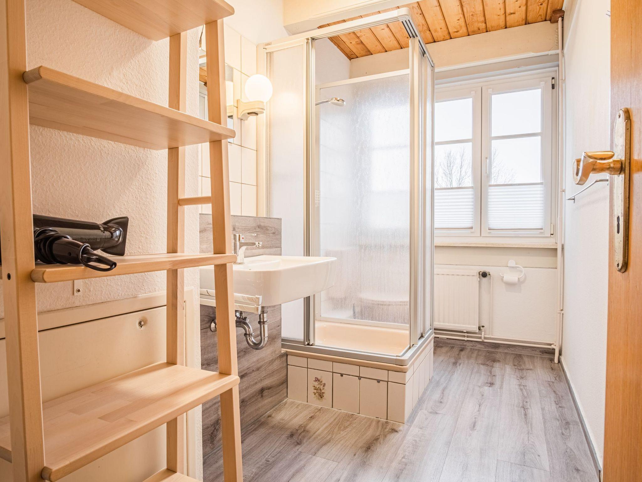 Im Badezimmer gibt es eine Dusche, ein WC und ein Fön.