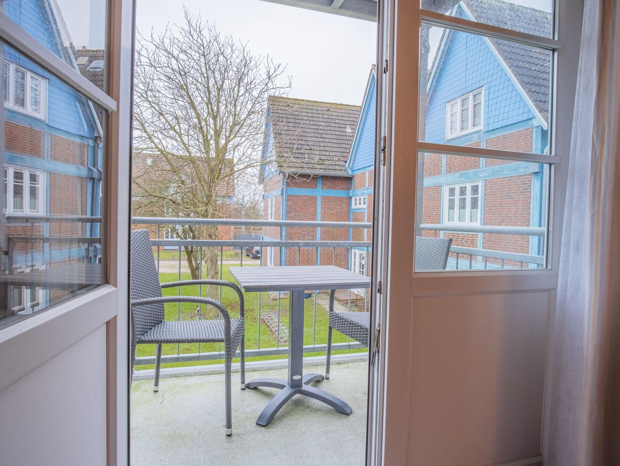 Ein Balkon mit Sitzmöglichkeit gehört auch zur Wohnung. Eine Liegewiese kann von allen Gästen des Hauses genutzt werden.