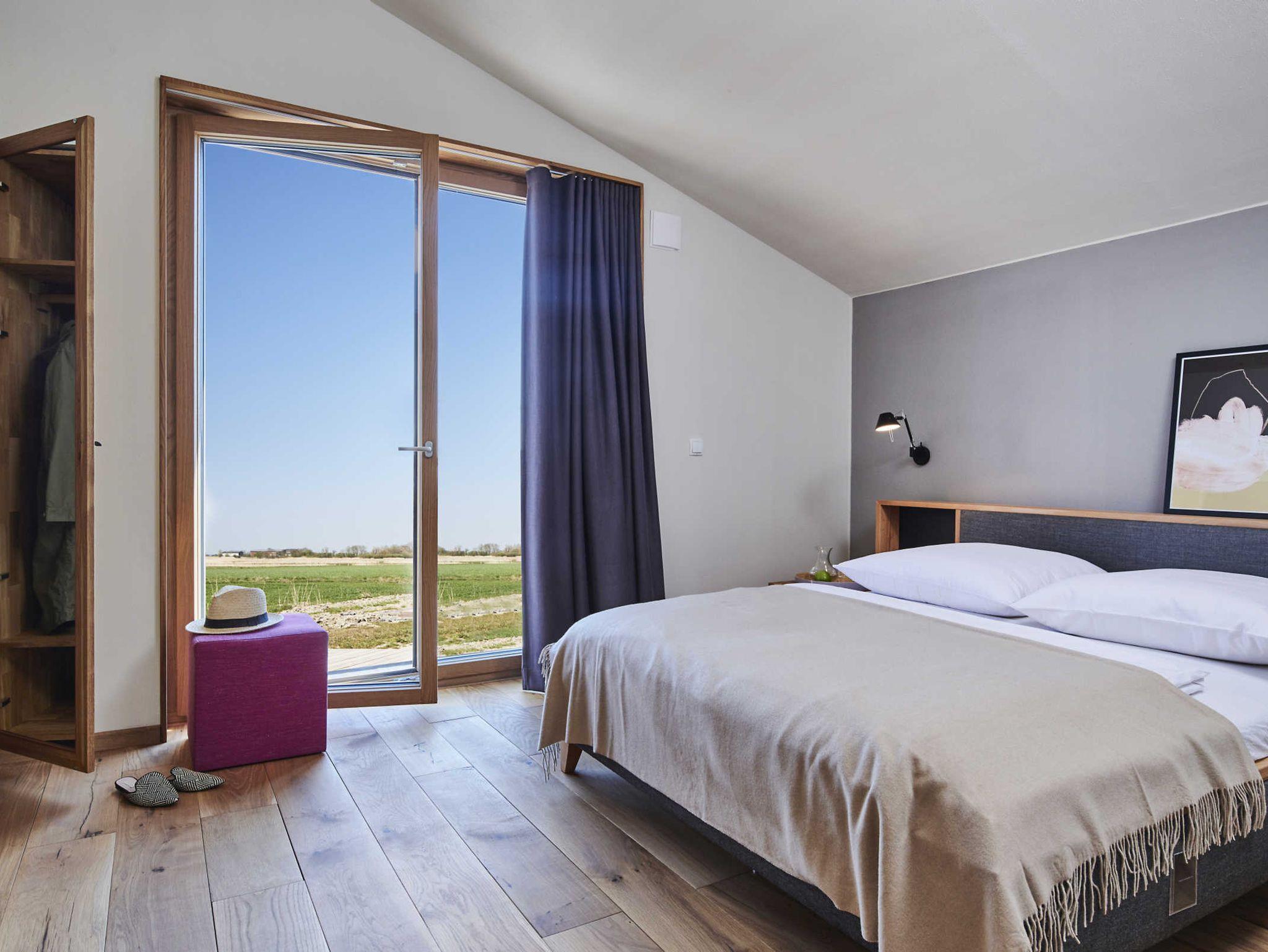 Die drei Schlafzimmer verfügen jeweils über ein Doppelbett (160x200) und einen großen Einbauschrank. Bei Bedarf kann ein Zustellbett (80x200, gegen Gebühr) ergänzt werden. Zwei der Schlafräume sind mit einem 32“-TV ausgestattet. Der majestätische Wohnraum (39 m²) mit einer Firsthöhe von 5,80 m und Galerie im Obergeschoss verfügt über einen Essbereich mit offener Küche und Tresen sowie einer Sofalandschaft mit 40“-TV und SONOS Soundbar. Die Soundanlage kann über Ihr Smartphone mittels SONOS-App gesteuert werden. Ergänzend zum Duschbad im Erdgeschoss verfügt das Obergeschoss über ein großzügiges Vollbad (18 m²) mit freistehender Badewanne, großer Sauna und Balkon. Die Loungemöbel der Galerie laden zum Lesen eines guten Buches ein oder man schaut einfach nur fasziniert durch die großen Panoramafenster in die Weite Pellworms. Alle Küchengeräte wie Induktionsherd, Spülmaschine und Kühlschrank mit 4-Sterne-Gefrierfach sowie Waschmaschine und Trockner stammen aus dem Hause Miele. Dank eines hochmodernen Glasfaseranschlusses ist eine leistungsstarke Internetverbindung (250 MBit) vorhanden (z.B. für Streaming). Das WLAN im Haus kann auf Wunsch deaktiviert werden.