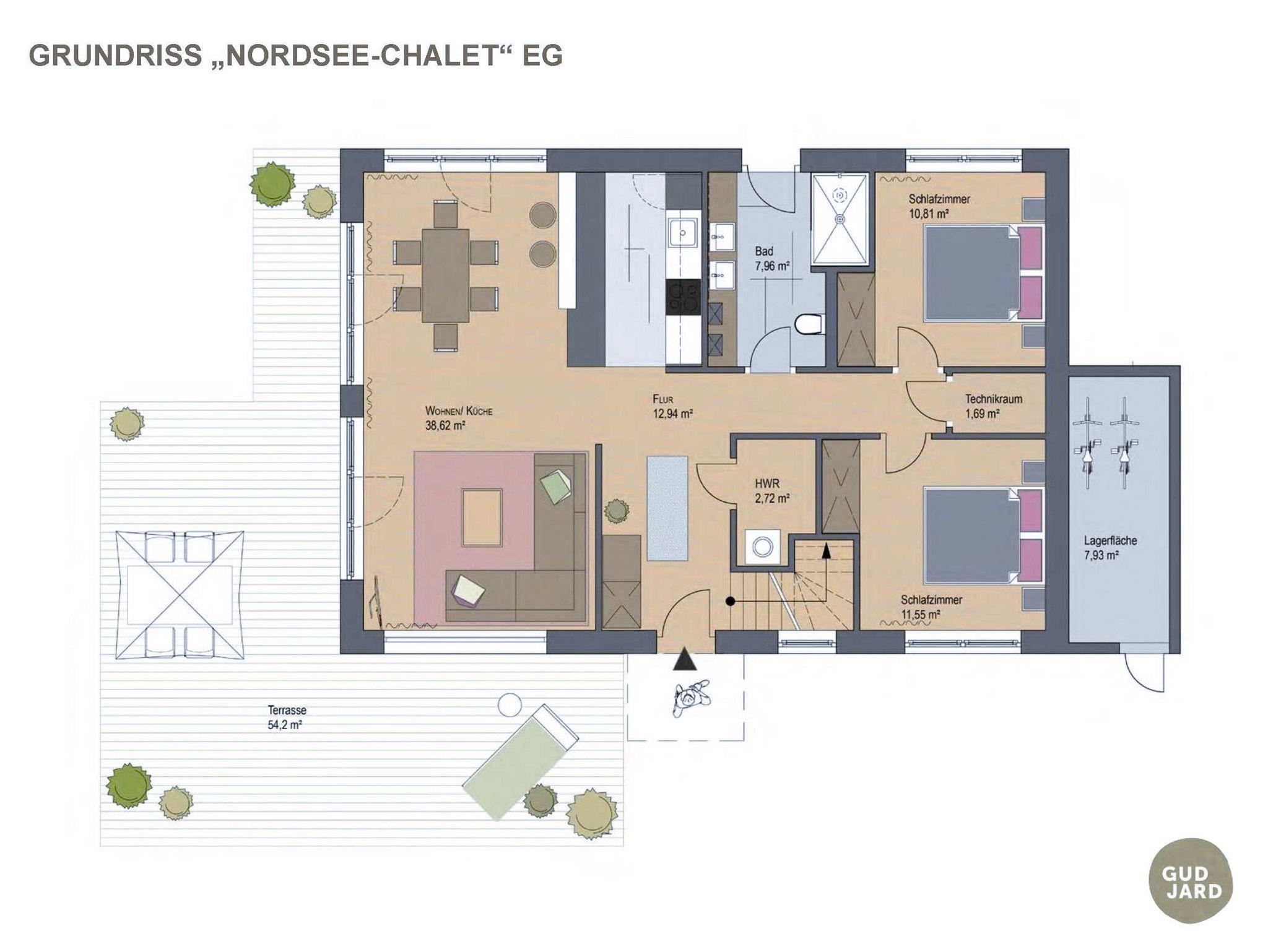 Das GUD JARD Chalet für 2 bis 7 Personen (139 m²), erfüllt höchste Ansprüche: Luxuriöses Bad mit privater Sauna, großzügige Terrasse (54 m²), eigener Garten, edles Design, SONOS Multiroom-Anlage, vollmassive Design-Holzmöbel und eine hochwertig ausgestattete Küche mit Induktionsherd lassen keine Urlaubswünsche offen. Auch in der großen Wohlfühl-Sauna kannst Du mittels des integrierten Bluetooth-Soundsystems Deine Lieblingsmusik genießen.