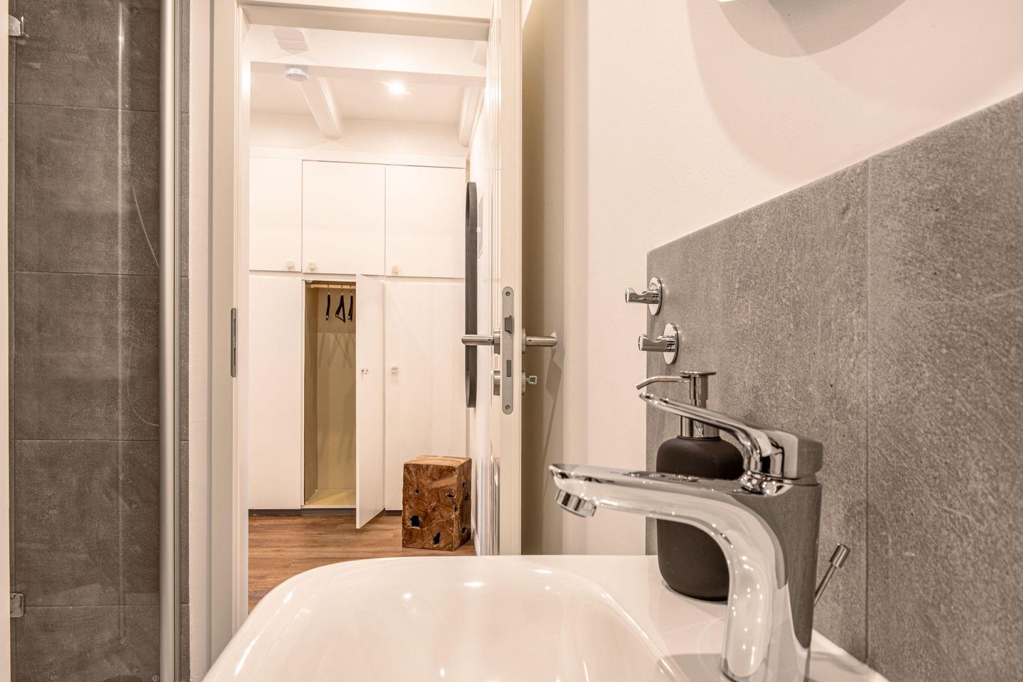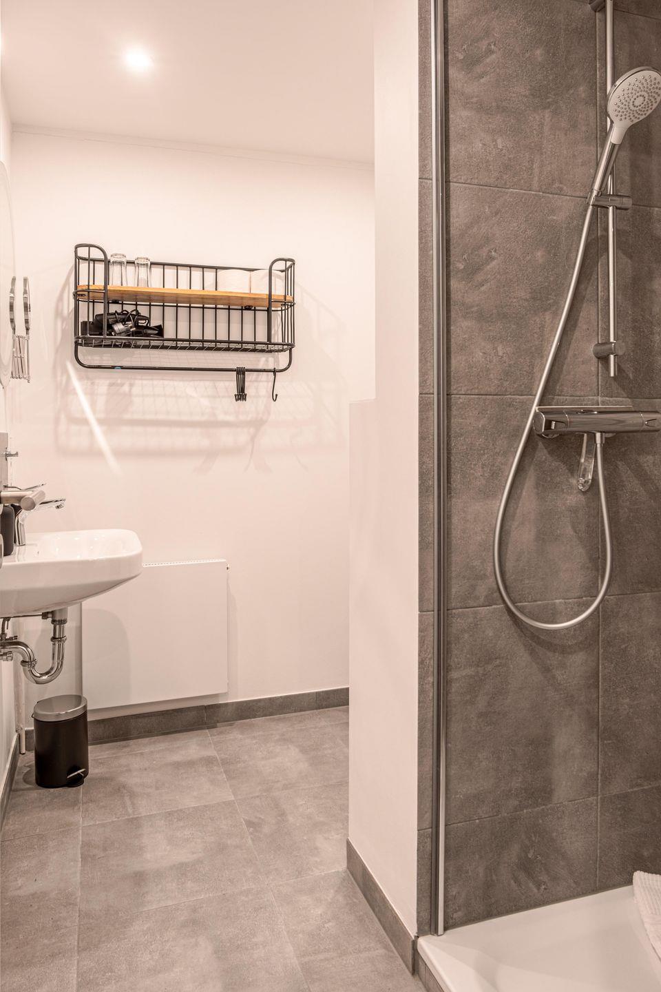 Das moderne Badezimmer ist mit einer Dusche, einem Haartrockner und Pflegeprodukten wie Seife und Shampoo ausgestattet. Ein Ganzkörperspiegel sowie frische Hand- und Badetücher sind selbstverständlich vorhanden und sorgen für zusätzlichen Komfort.