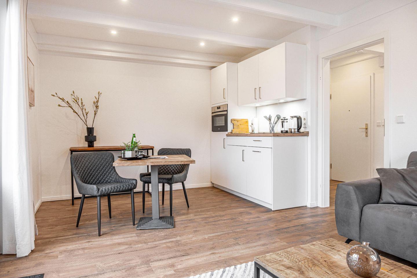 Die lichtdurchflutete Wohnung verfügt über ein geschmackvoll eingerichtetes Schlafzimmer oder Wohnbereich, der Ihnen den idealen Rückzugsort bietet, um nach einem aktiven Tag in der Natur zu entspannen. Die Küche, die elegant in das Wohnambiente eingebettet ist, ist mit modernen Annehmlichkeiten wie Cerankochfeld, Backofen, Kühlschrank, Mikrowelle, Geschirrspüler und weiteren Küchenutensilien ausgestattet. Hier können Sie ganz einfach kulinarische Genüsse zubereiten. Ein optionaler Brötchenservice kann Ihren Morgen noch genussvoller machen.