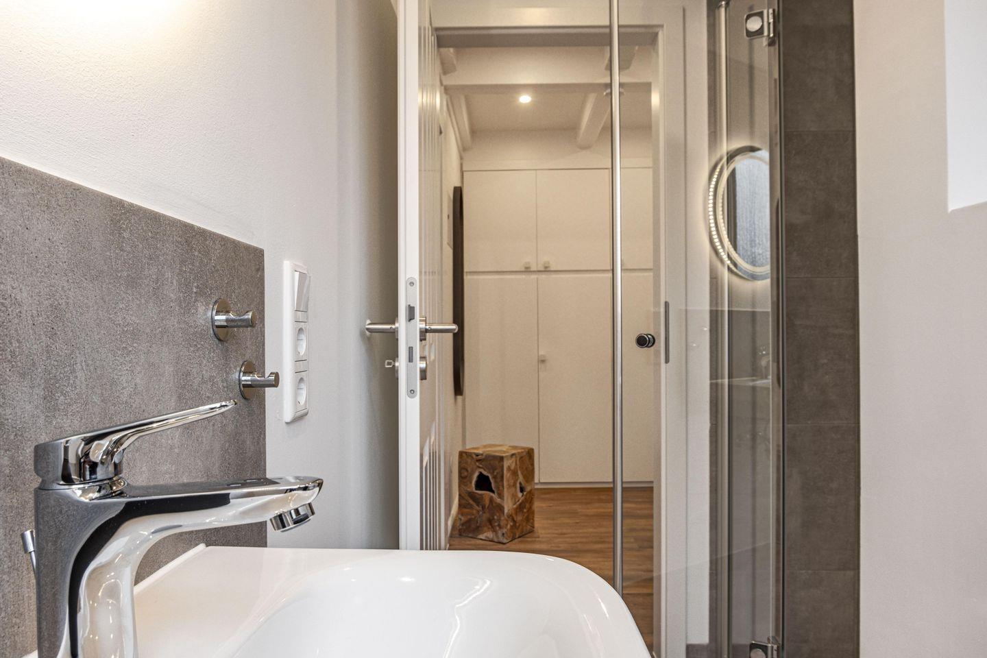 Das moderne Badezimmer ist mit einer Dusche, einem Haartrockner und Pflegeprodukten wie Seife und Shampoo ausgestattet. Ein Ganzkörperspiegel sowie frische Hand- und Badetücher sind selbstverständlich vorhanden und sorgen für zusätzlichen Komfort.