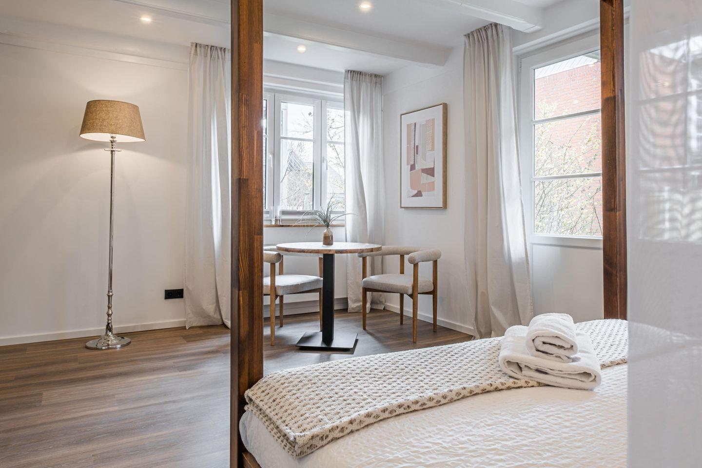 Der helle Wohn- und Schlafraum ist mit einem komfortablen Doppelbett, einem Esstisch sowie einem Fernseher mit SAT-Anschluss ausgestattet – ideal zum Ausspannen nach einem erlebnisreichen Tag. WLAN steht Ihnen selbstverständlich kostenlos zur Verfügung. Die moderne Küchenzeile aus dem Jahr 2022 lässt keine Wünsche offen: Ein Cerankochfeld mit vier Platten, Backofen, Kühlschrank, Geschirrspüler, Kaffeemaschine, Toaster und Wasserkocher stehen bereit für kleine und große Kochideen.