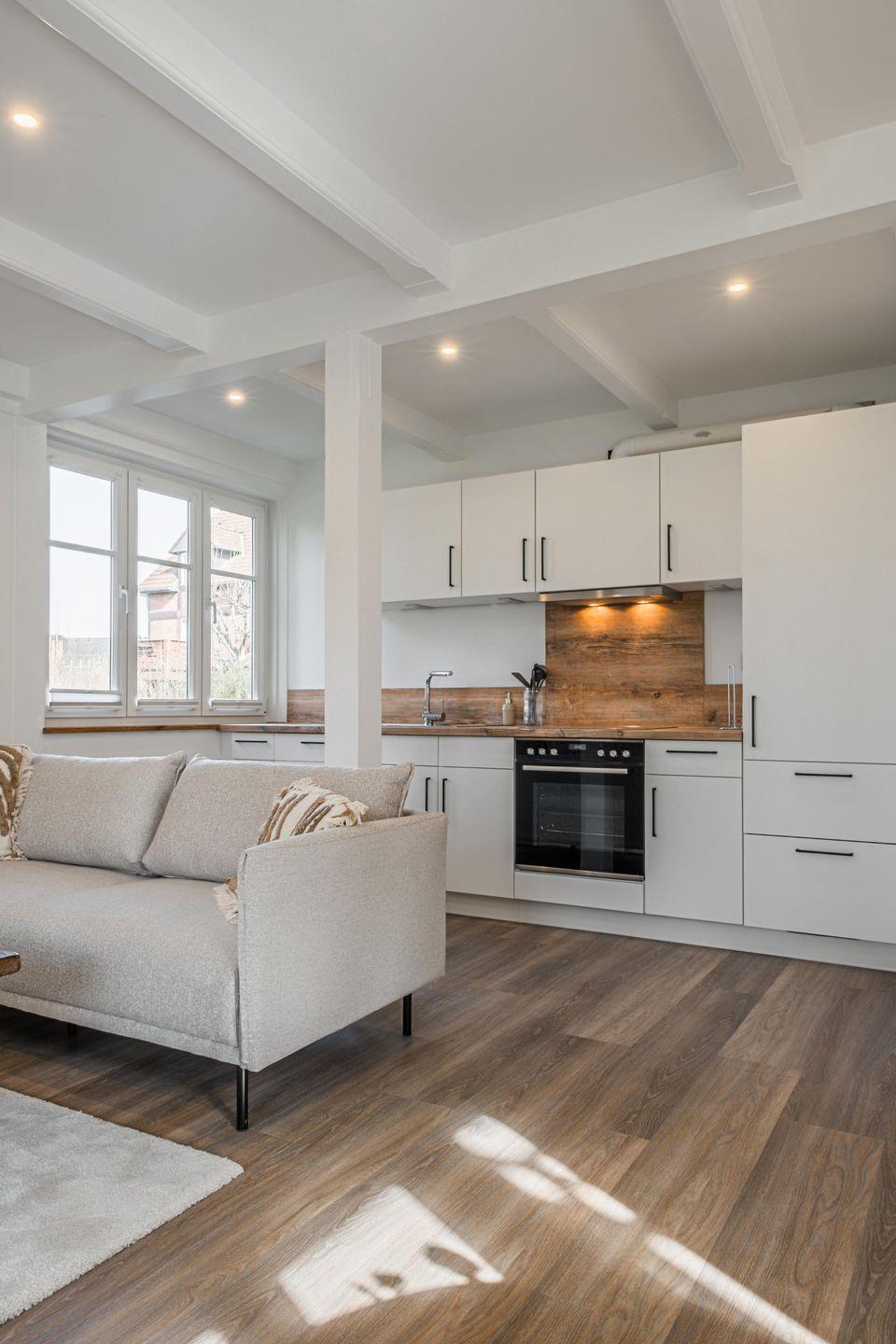 Die moderne und voll ausgestattete Küche – mit Cerankochfeld, Backofen, Mikrowelle, Kühlschrank, Geschirrspüler, Kaffeemaschine, Toaster und Wasserkocher – lädt zum gemeinsamen Kochen ein. Das großzügige Badezimmer verfügt über Dusche, WC und einen Fön.
