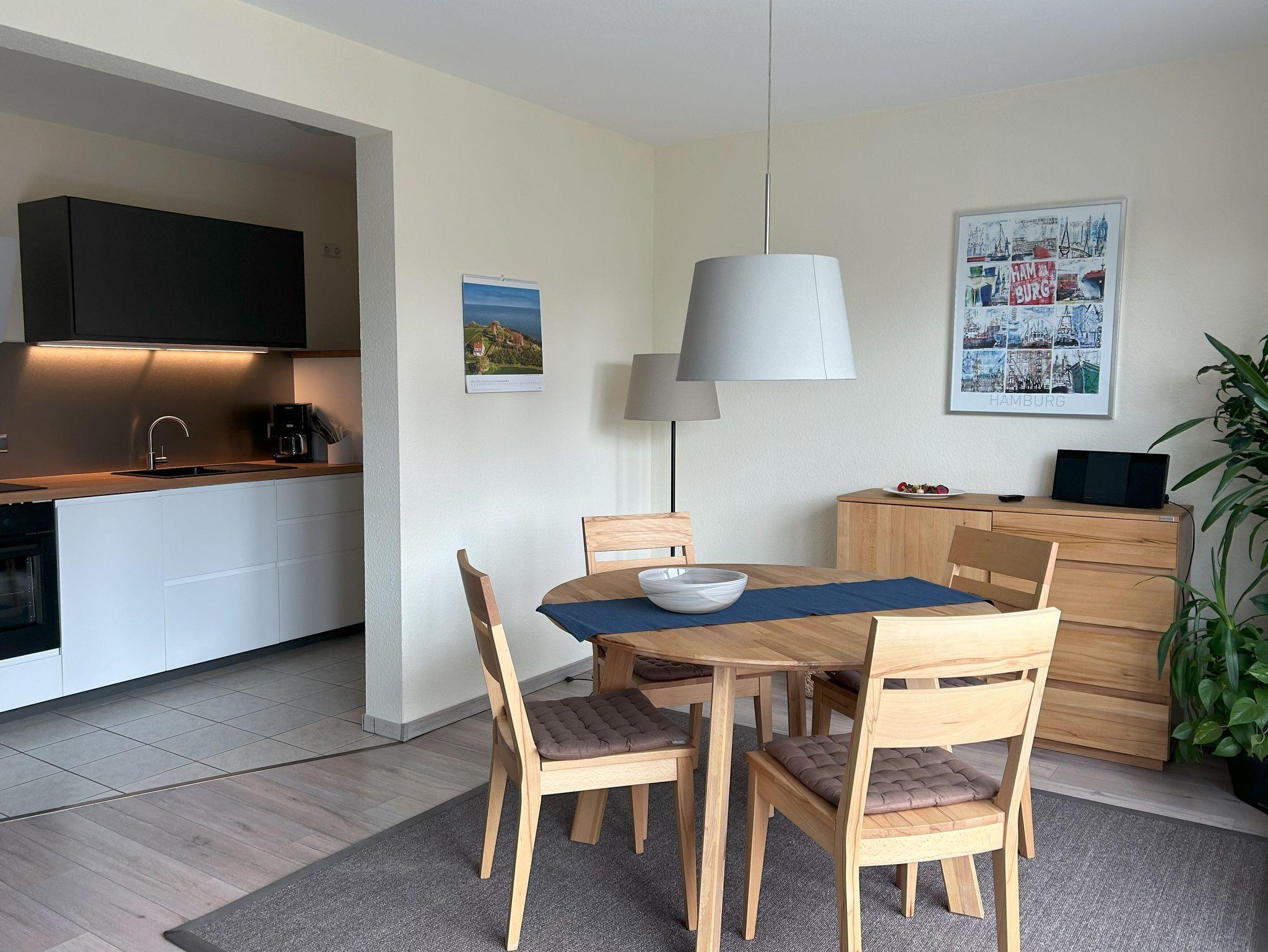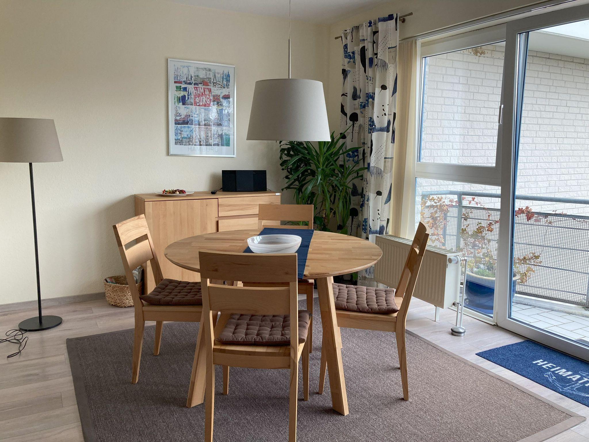 Die Wohnung hat einen offenen Wohn-Essbereich. Das Wohnzimmer mit TV, DVD und Stereoanlage ist nach Südosten ausgerichtet und verfügt über eine durchgehende Fensterfront zum Balkon. In der komplett eingerichteten Einbauküche befinden sich auch Geschirrspüler und Mikrowelle. Es gibt ein seperates Schlafzimmer im dänischen Stil mit Doppelbett und getrennten Matratzen (1,80 x 2 m) im dänischen Stil, ein Badezimmer mit Dusche, WC und Waschmaschine.
