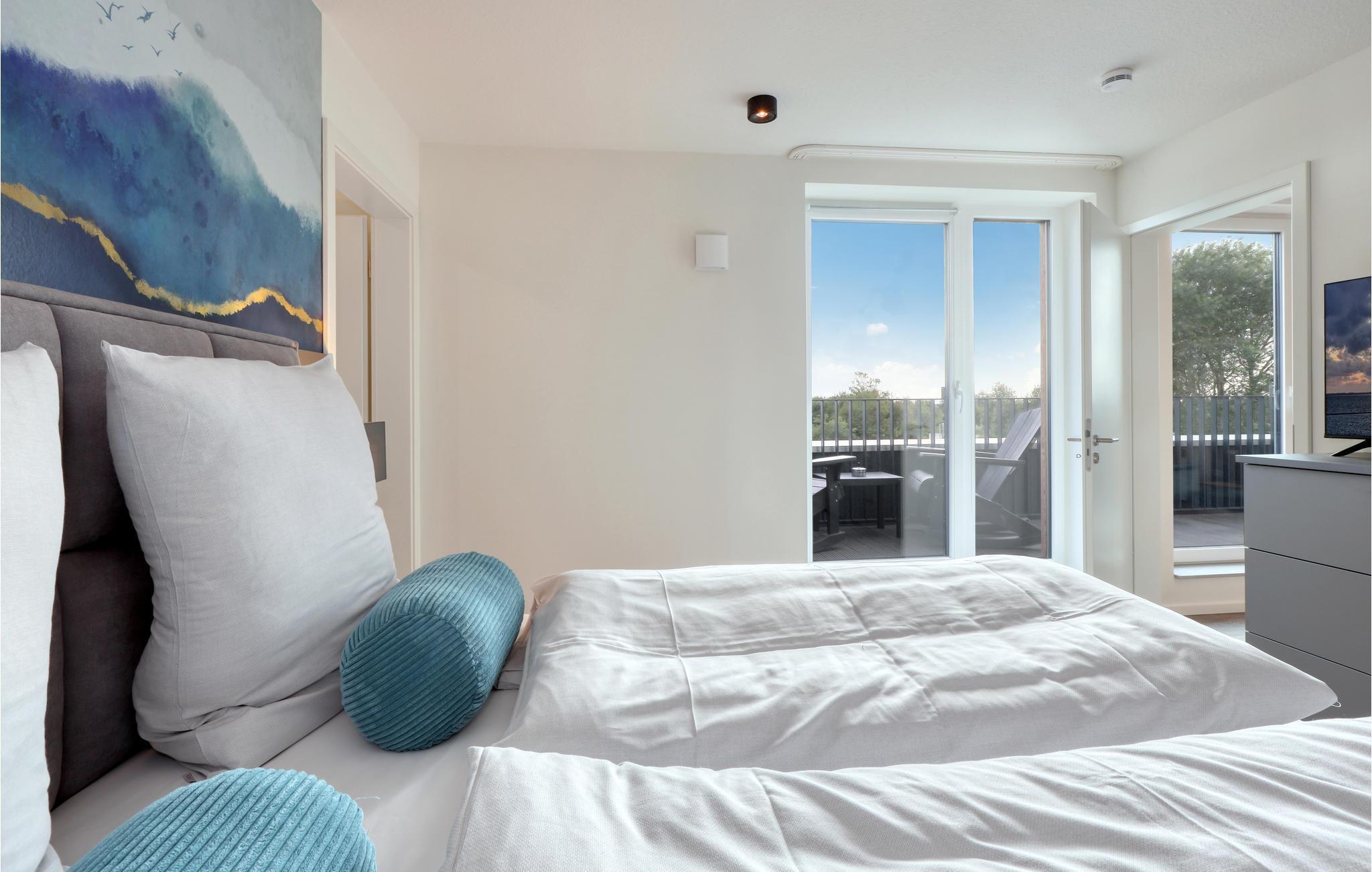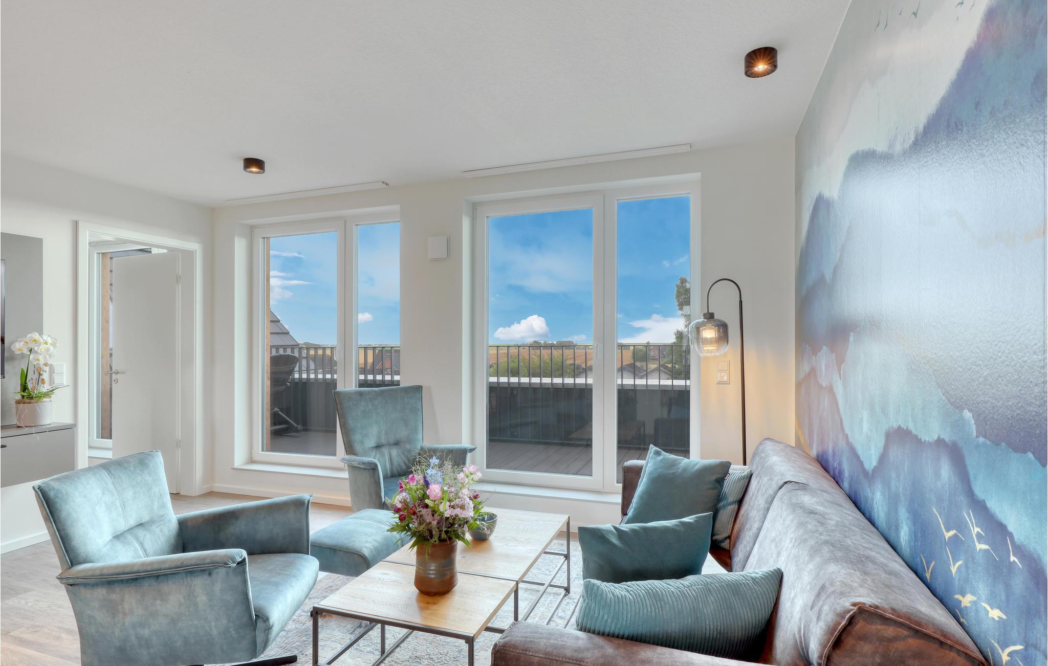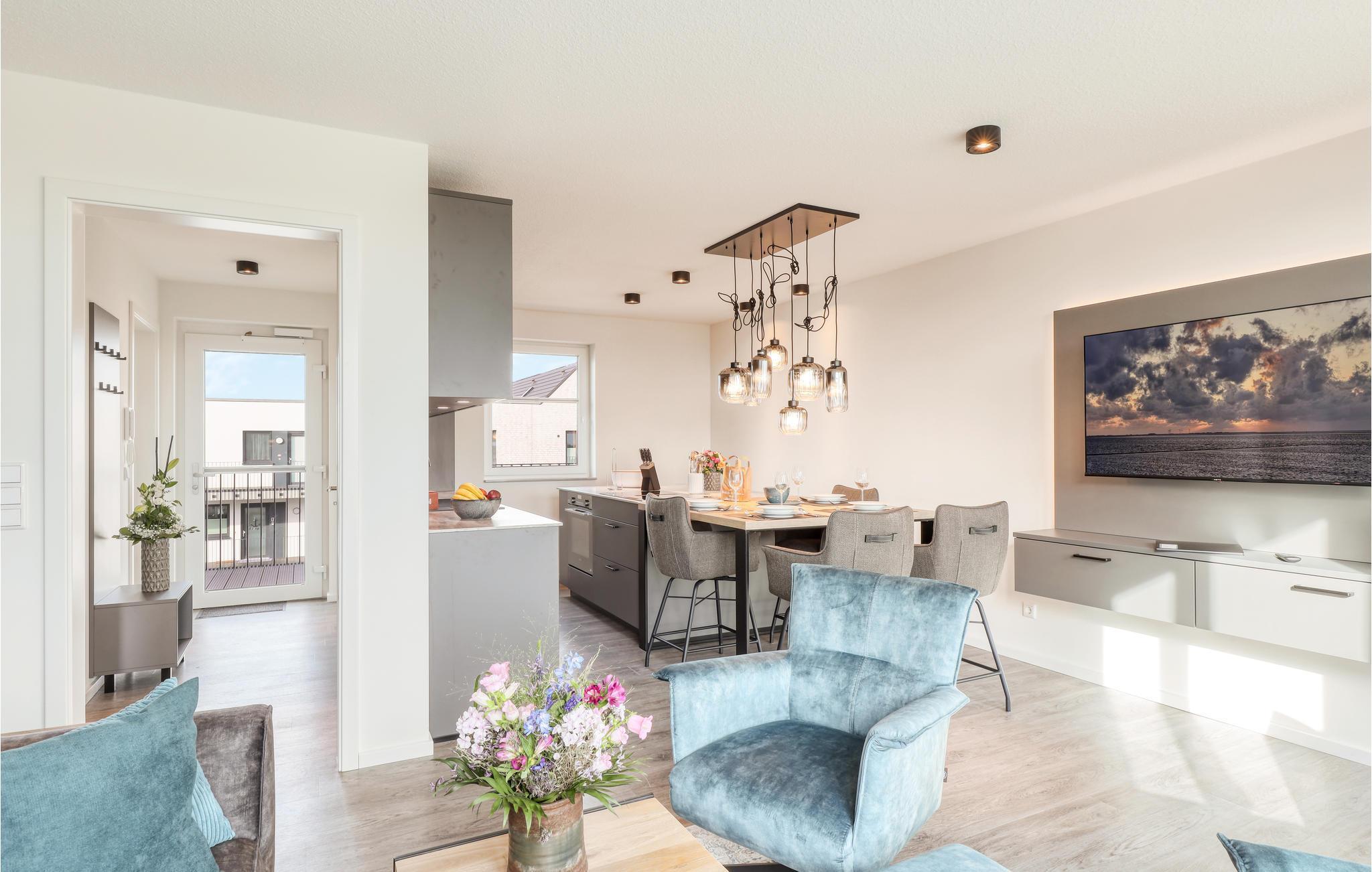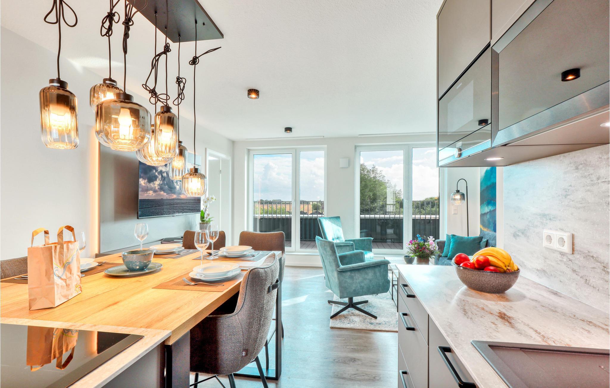 Velkommen til Nordstrand, en vakker halvøy på Schleswig-Holsteins nordsjøkyst i Vadehavet, som står på UNESCOs verdensarvliste. Det moderne huset med flere ferieleiligheter er en ekte juvel midt i naturen, og beliggenheten rett bak diget får hjertet til enhver Nordsjø-fan til å slå raskere. Det moderne maritime uttrykket i den eksklusive toppleiligheten setter deg umiddelbart i feriestemning. Sjenerøse vindusflater slipper inn rikelig med dagslys og gir en fantastisk utsikt over det omkringliggende landskapet. Med sitt fokus på bærekraft er feriehuset det ideelle stedet for feriegjester som setter pris på avslapning i harmoni med naturen. Start dagen med en deilig frokost i den koselige stuen med åpen kjøkkenløsning, og nyt utsikten fra takterrassen når det er fint vær.