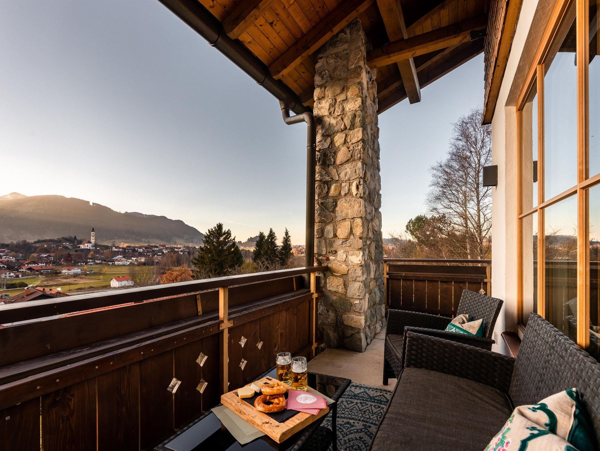 Terrasse mit eigener Sauna, Zugang zur Liegewiese und zum Barfußpfad, Panoramablick auf Pfronten und dessen Berge