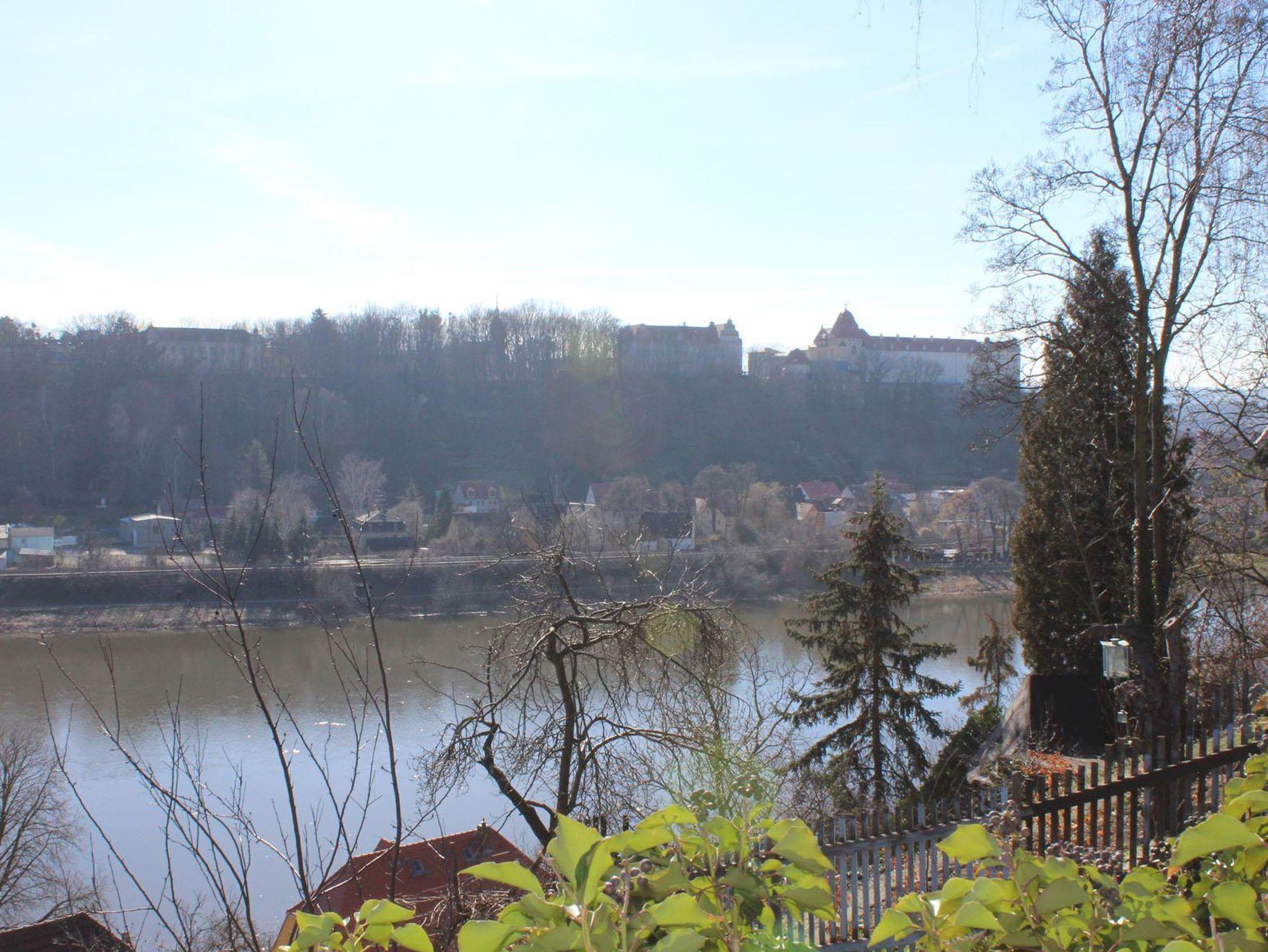 Als räumliche Trennung zum Ehebett wurde ein Raumteiler aus Holzbalken in Fachwerk-Optik errichtet. Das Highlight dieses lichtdurchflutenden Raumes bildet der Balkon, der einem einen traumhaften Blick auf die Elbe, in den Garten, auf den zum Grundstück gehörenden Hang sowie den malerisch gelegenen Gegenhang bietet. Der Balkon bietet seinen Gästen zu jeder Tageszeit Ruhe und Entspannung. Man wird nicht müde, das Treiben auf der Elbe und auf den angrenzenden Radwegen zu verfolgen. Selbst vom Doppelbett aus hat man einen unverbauten Blick auf die Elbe. Wer es liebt, kann schon vor dem Aufstehen vom Bett aus bei schönster Aussicht Urlaubsflair genießen.