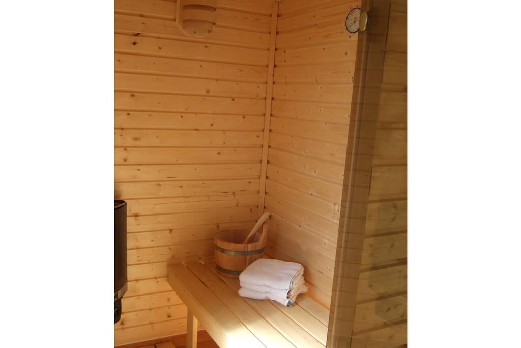 Ground floor: (hallway(Mirror, Wardrobe Coatrack), Kitchen(stove, hob, dishwasher, fridge), Living/diningroom(Sofa, TV, dining table, fireplace), bedroom(Bed Linen, Wardrobe, double bed), bathroom(Mirror, toilet, shower, washbasin), relaxation area(sauna), storage) On the 1st floor: (hallway, bedroom(Bed Linen, Wardrobe, double bed), bedroom(Bed Linen, Wardrobe, single bed, single bed), bathroom(Mirror, toilet, bath tub, washbasin)) Hot Water, Vacuum Cleaner, Internet access, washing machine, balcony(garden furniture), terrace(garden furniture, awning), garden(Barbecue center, Lawn, garden furniture, sun loungers, Garden shed), ironing board, iron, drying cabinet