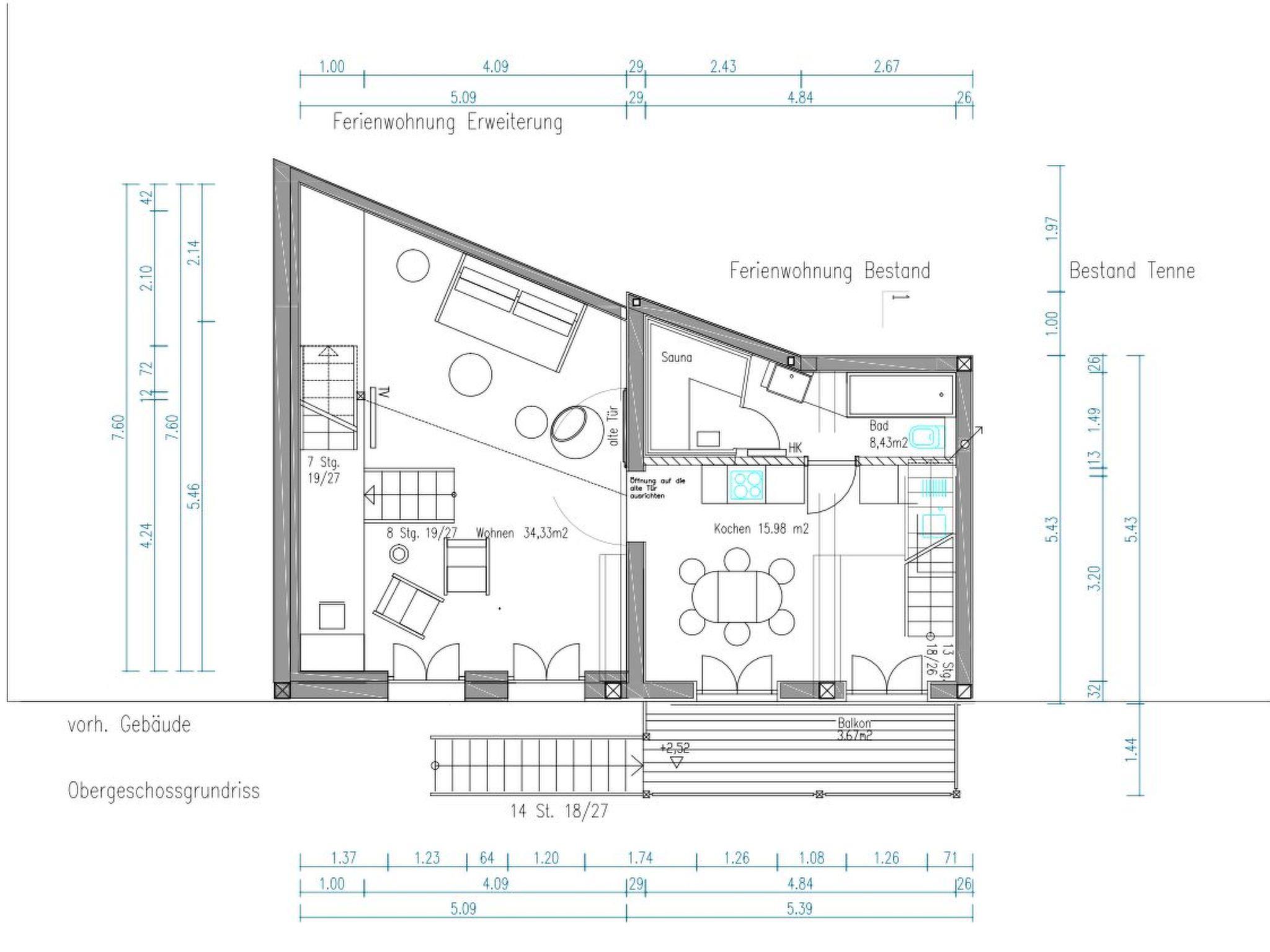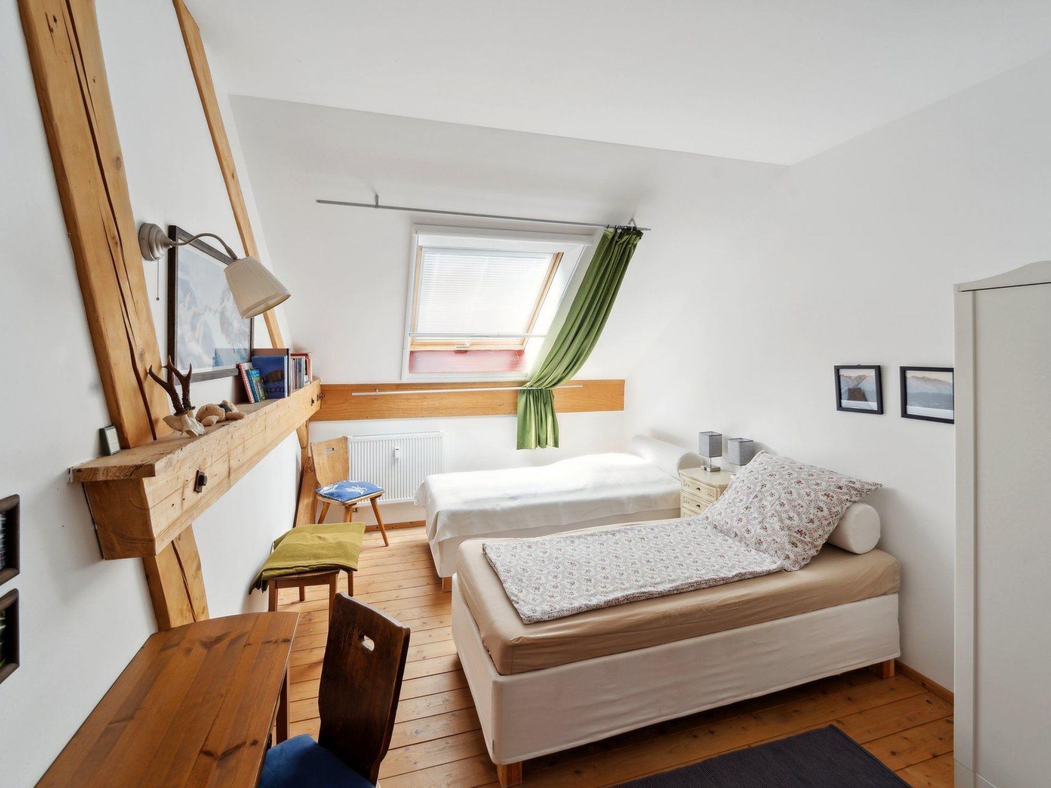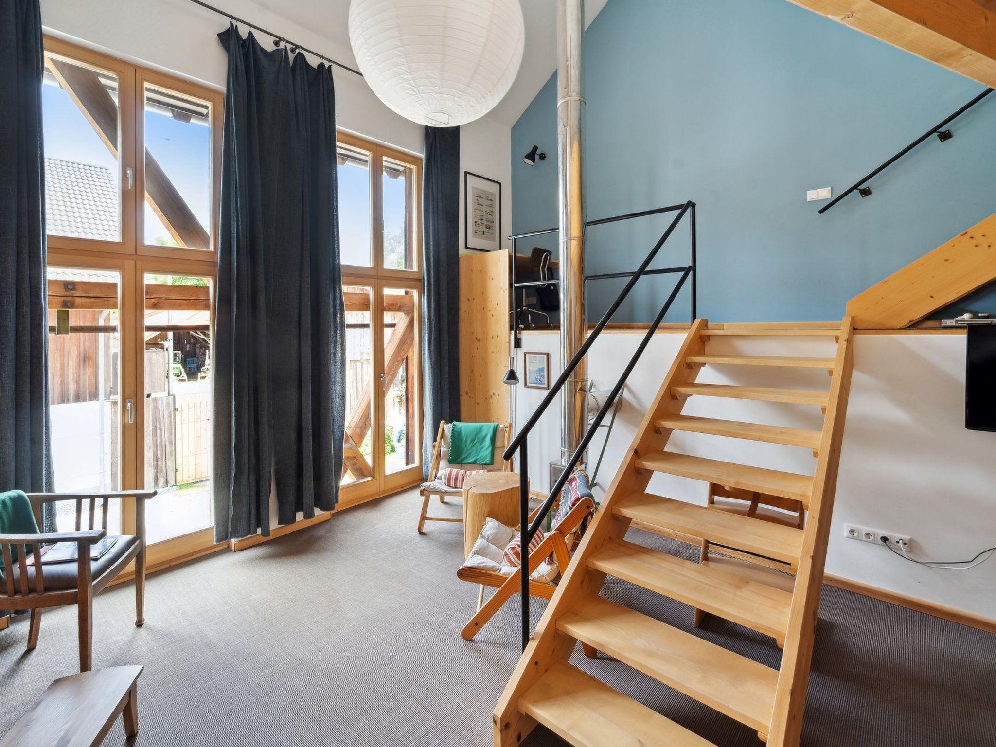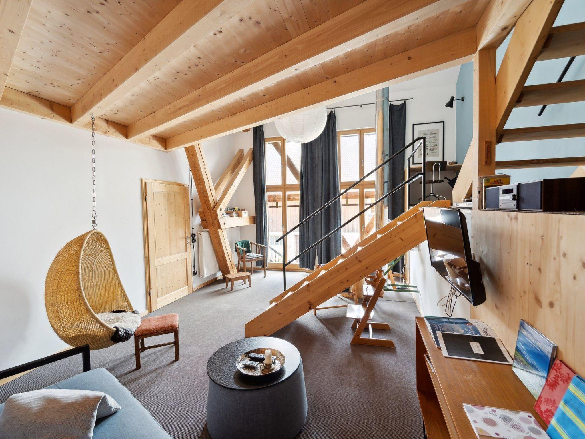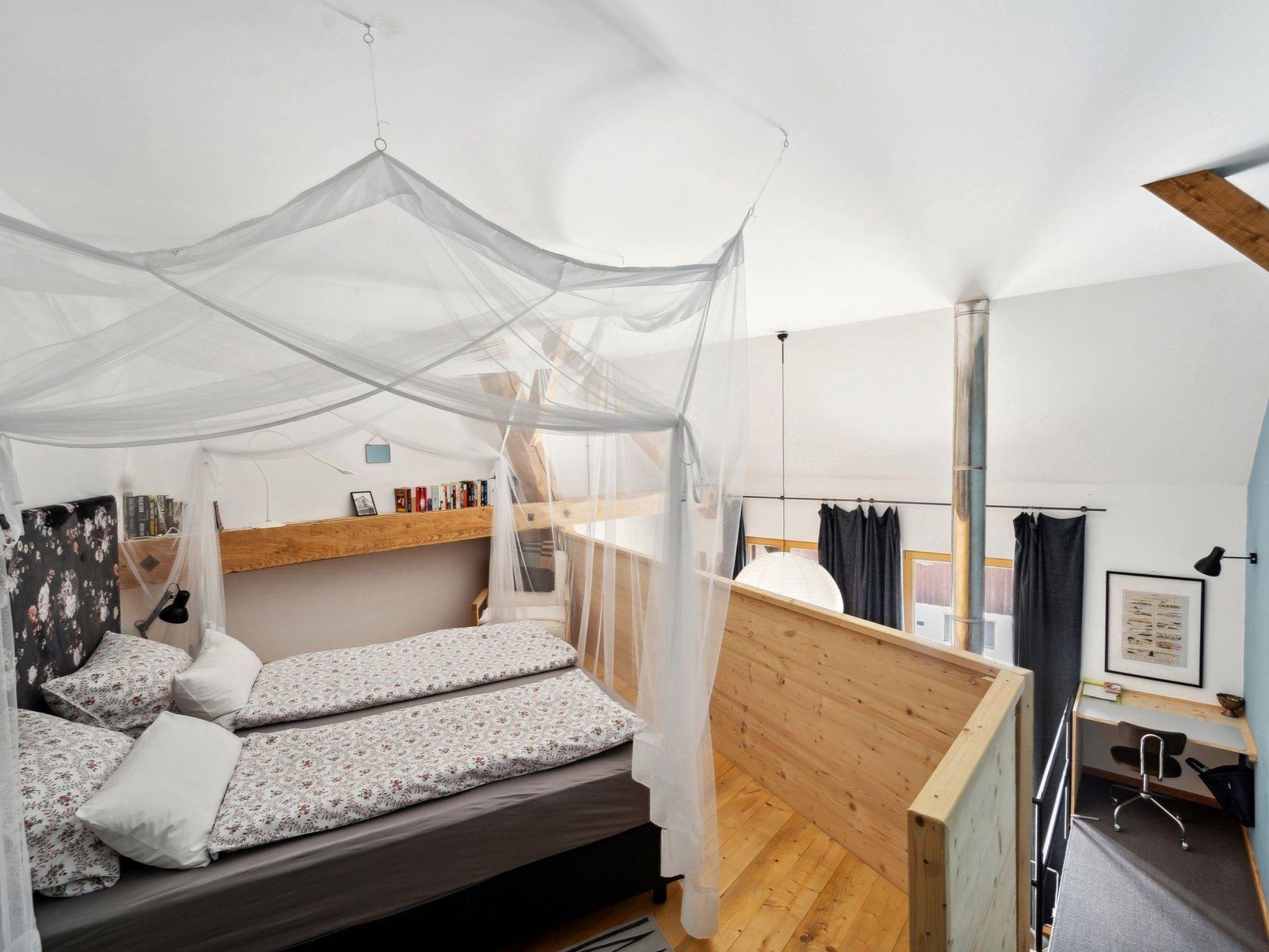 In 2004, the former barn of the farm was transformed into a cosy holiday flat, which was extended in 2018 to include an airy living room with sleeping gallery. The flat is characterised by its organic construction and the use of selected materials. The interior conveys a romantic atmosphere with attention to detail. Light colours, original wooden beams and the inviting incidence of light create a unique ambience. The mezzanine level with workstation, a fully equipped kitchen under another small gallery and a spacious dining area round off the living experience.