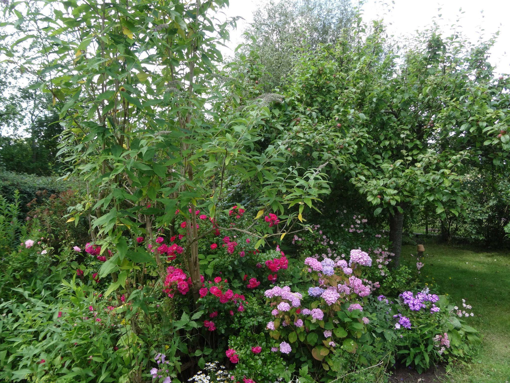Im schönen Garten hat jede Ferienwohnug eine separate Sitzgelegenheit mit Gartenmöbeln, Grill und Sonnenschirm. Der Gast sitzt inmitten von blühenden Planzen und Obstbäumen.
