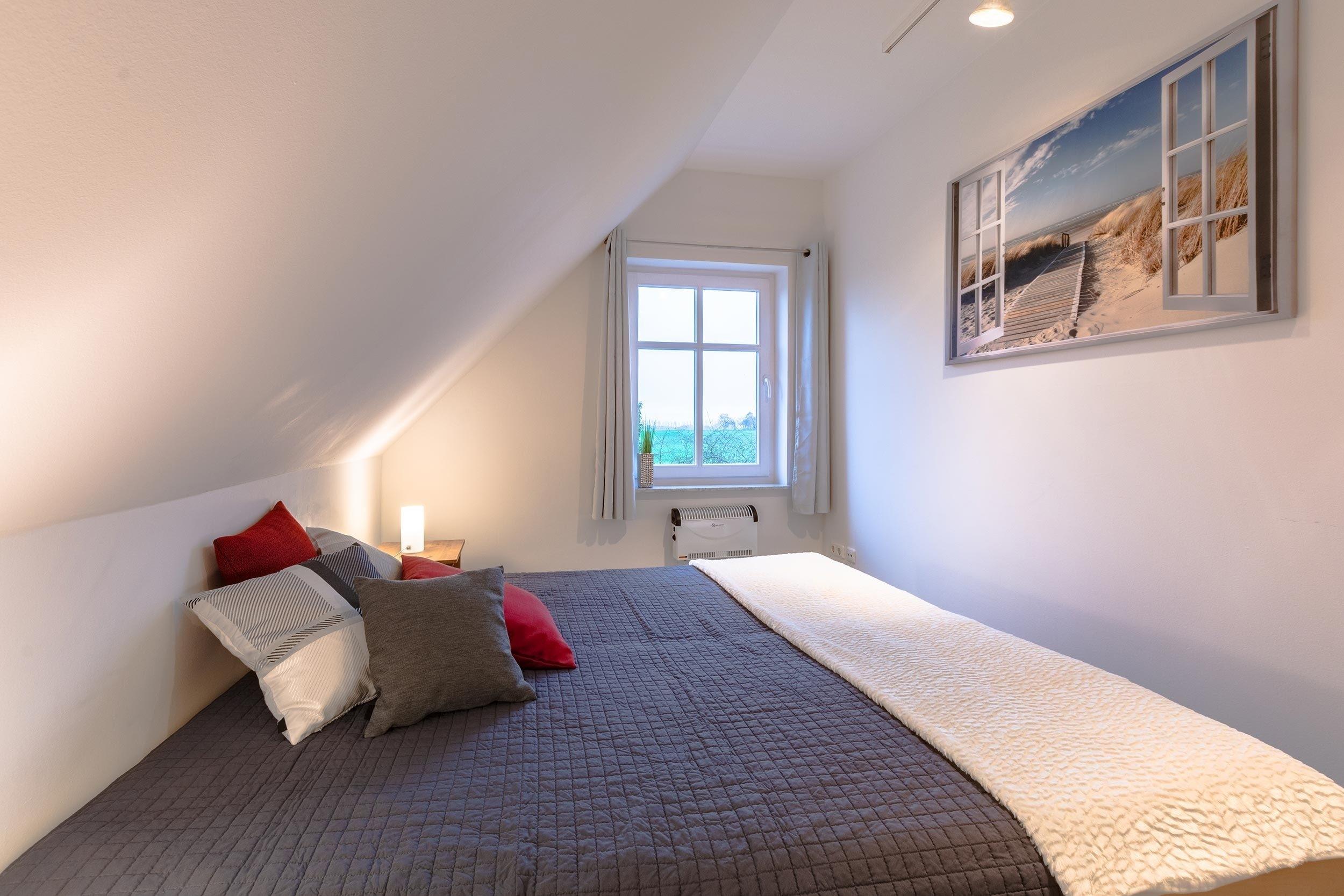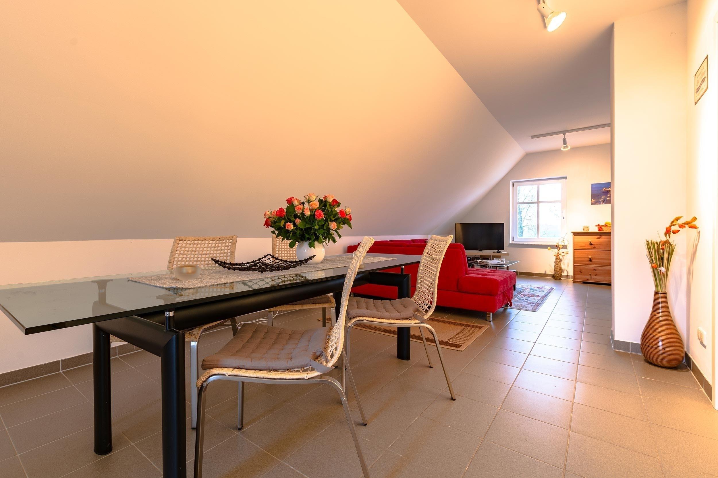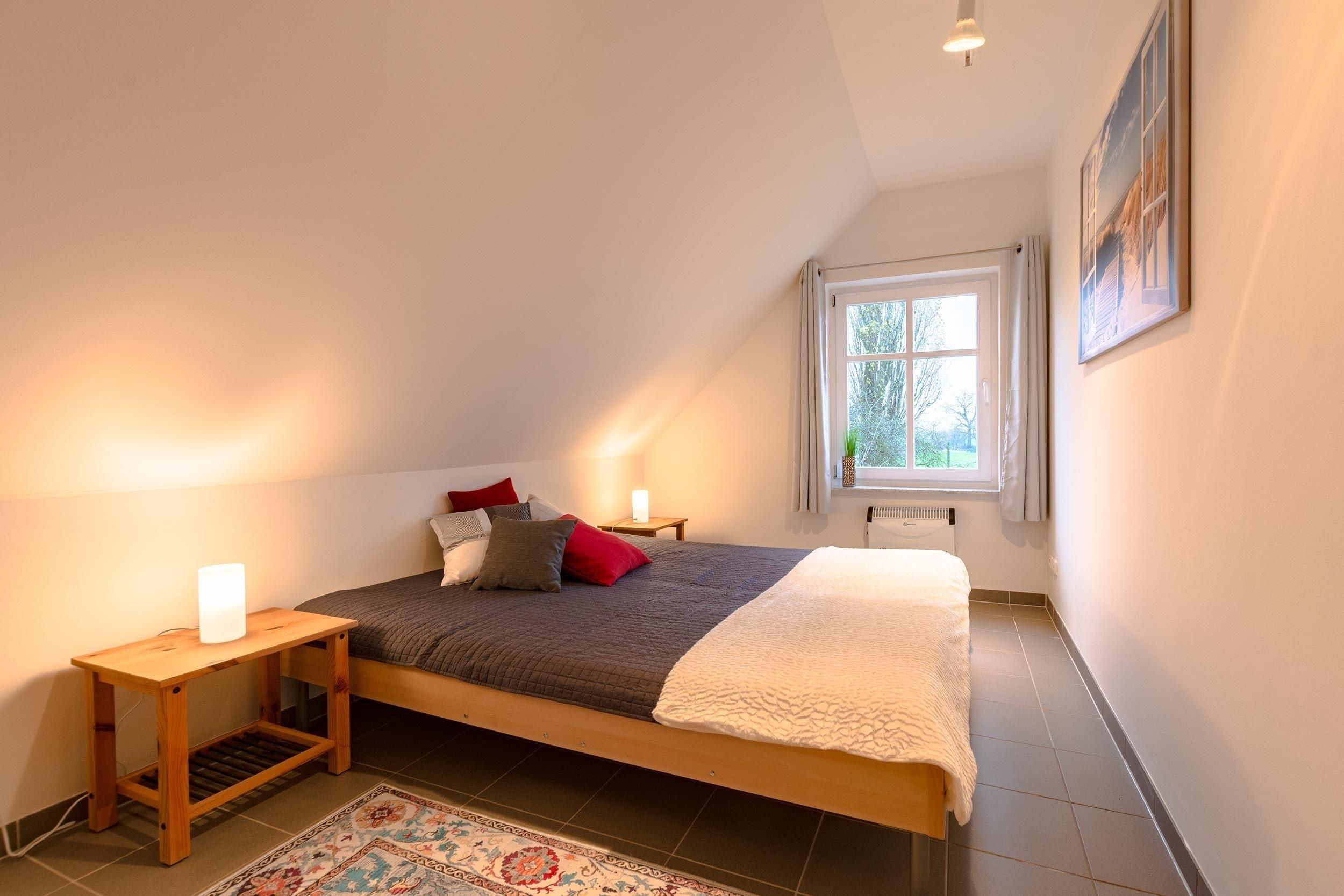 Das gesamte obere Geschoss bildet eine sehr geschmackvoll eingerichtete Ferienwohnung Apfelgarten. Im großzügigen, offenen Wohn-/Essbereich gibt es einen großen Esstisch mit vier Stühlen. Zum Relaxen lädt eine gemütliche Eck-Couch ein, die schnell zum Bett umgebaut werden kann. Hier kann eine zusätzliche Person bequem schlafen. Die offene Küche ist voll ausgestattet. Im angrenzenden Schlafzimmer haben Sie ein klassisches Doppelbett und einen Schrank.