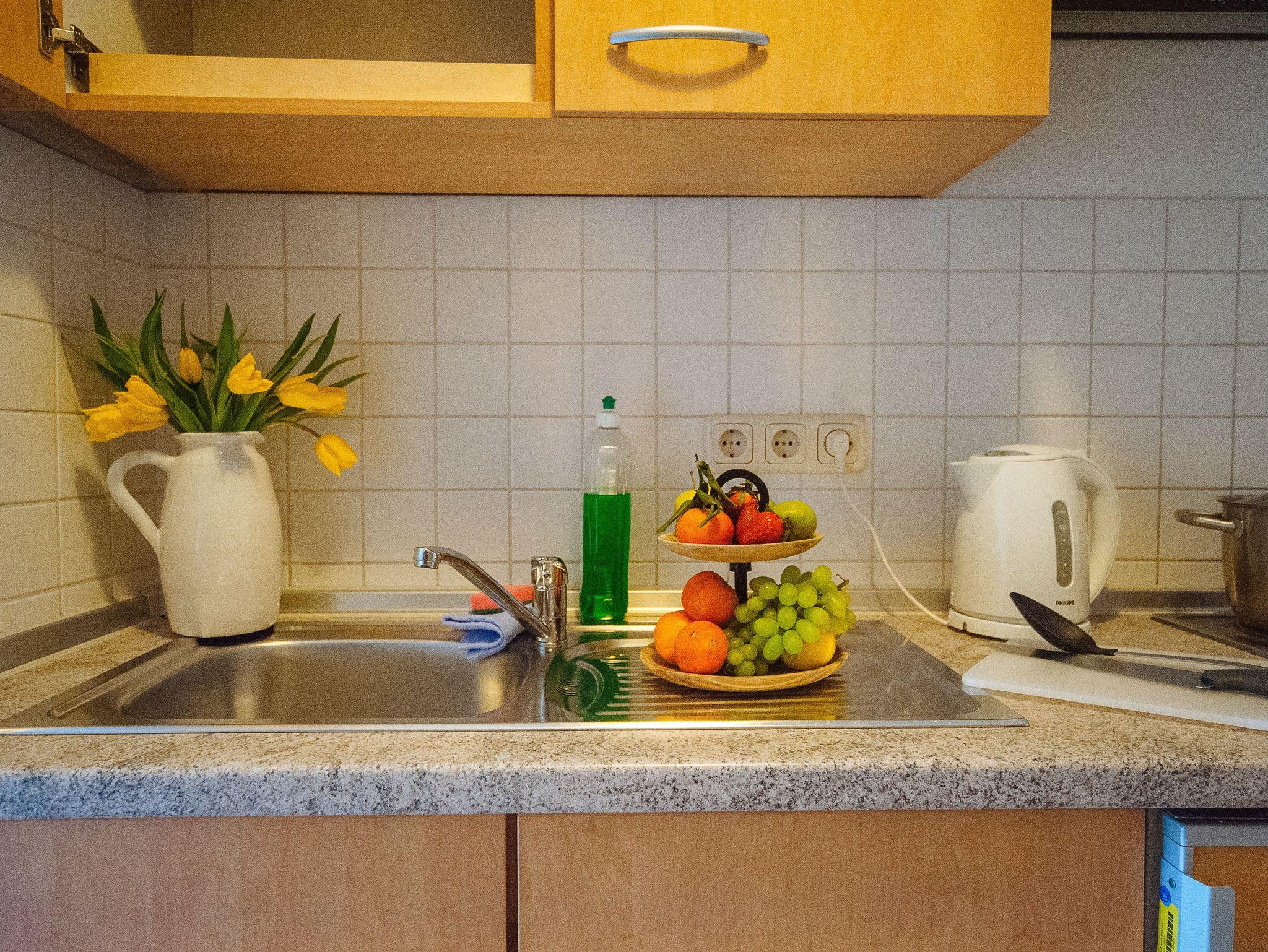 In allen Ferienapartments mit Küche genießen Sie den Blick in den Garten und auf das angrenzende Feld.