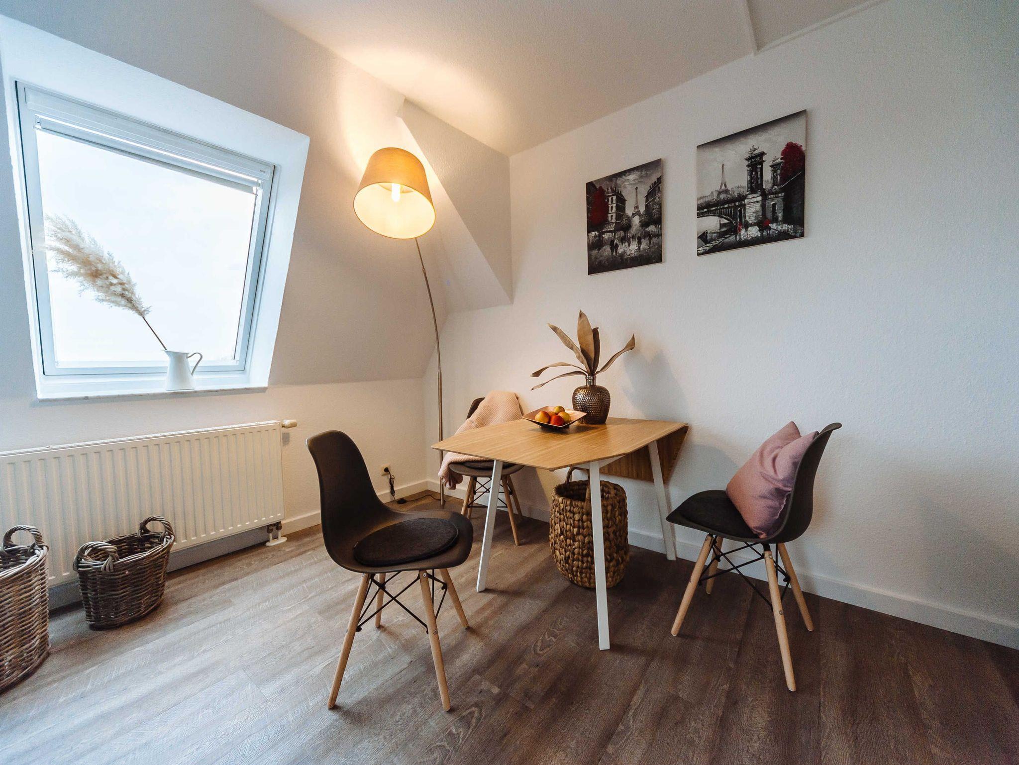Das Kutscherhaus liegt in einem Nebengebäude auf dem Grundstück des Apartmenthauses. Es verfügt über einen eigenen EIngang, eine eigene Terasse und hat ebenerdig einen wunderbaren Blick in unserem Garten. Das Apartment verfügt über einen Eingangsbereich mit Garderobe und Sitzmöglichkeit, ein Wohnraum mit (Schlaf)Sofa, einen zusätzlichen Schlafraum mit Doppelbett und einer voll ausgestatteten Küche mit Backofen. Das Badezimmer ist behindertenfreundlich mit ebenerdiger Dusche. In diesem Apartment ist kein WLAN Zugang vorhanden. Das Apartment wurde im Jahr 2018 neu renoviert und ausgestattet.