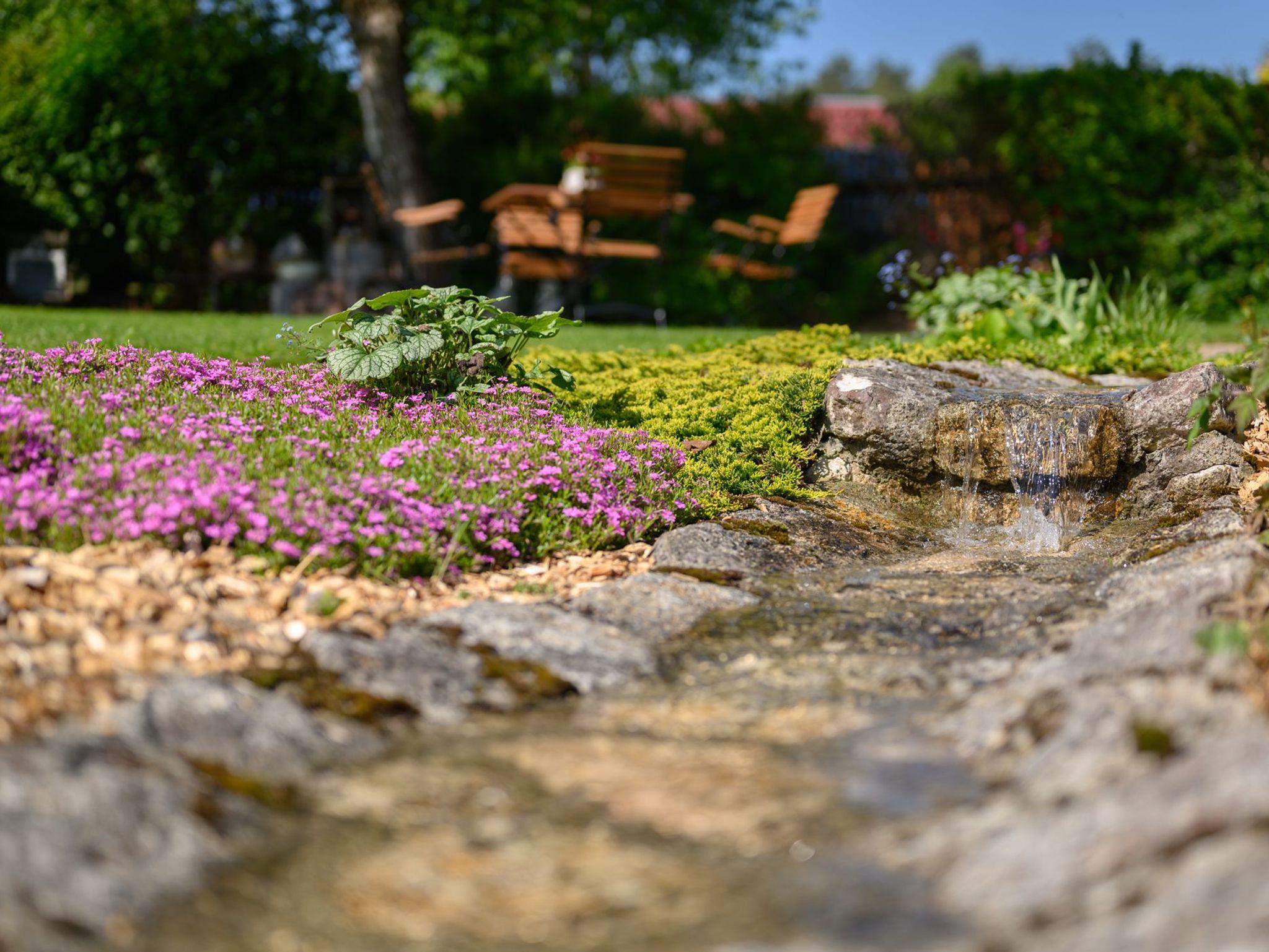 Im Außenbereich laden auf einer teils überdachten Terrasse eine Naturstamm-Sitzgruppe sowie auch Liegestühle zum Entspannen ein.