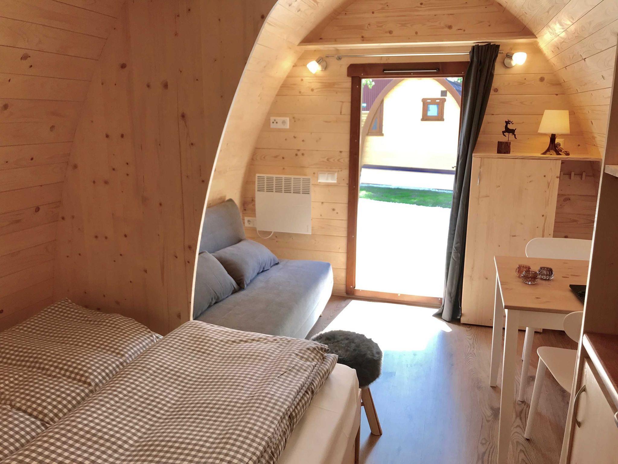 Insgesamt verfügen wir über 8 Holzhäuser mit identischer Ausstattung. Alle Holzhäuser sind mit Bad/Dusche und einer Miniküche ausgestattet. Die winterfeste Ausstattung sowie eine Heizung bieten auch ganzjährig einen warmen, kuscheligen Wohnkomfort umgeben von Holz. Alle Lodges eignen sich idealerweise für zwei bis drei Personen, mit Kindern kannst Du das Haus auch mit vier Personen bewohnen.