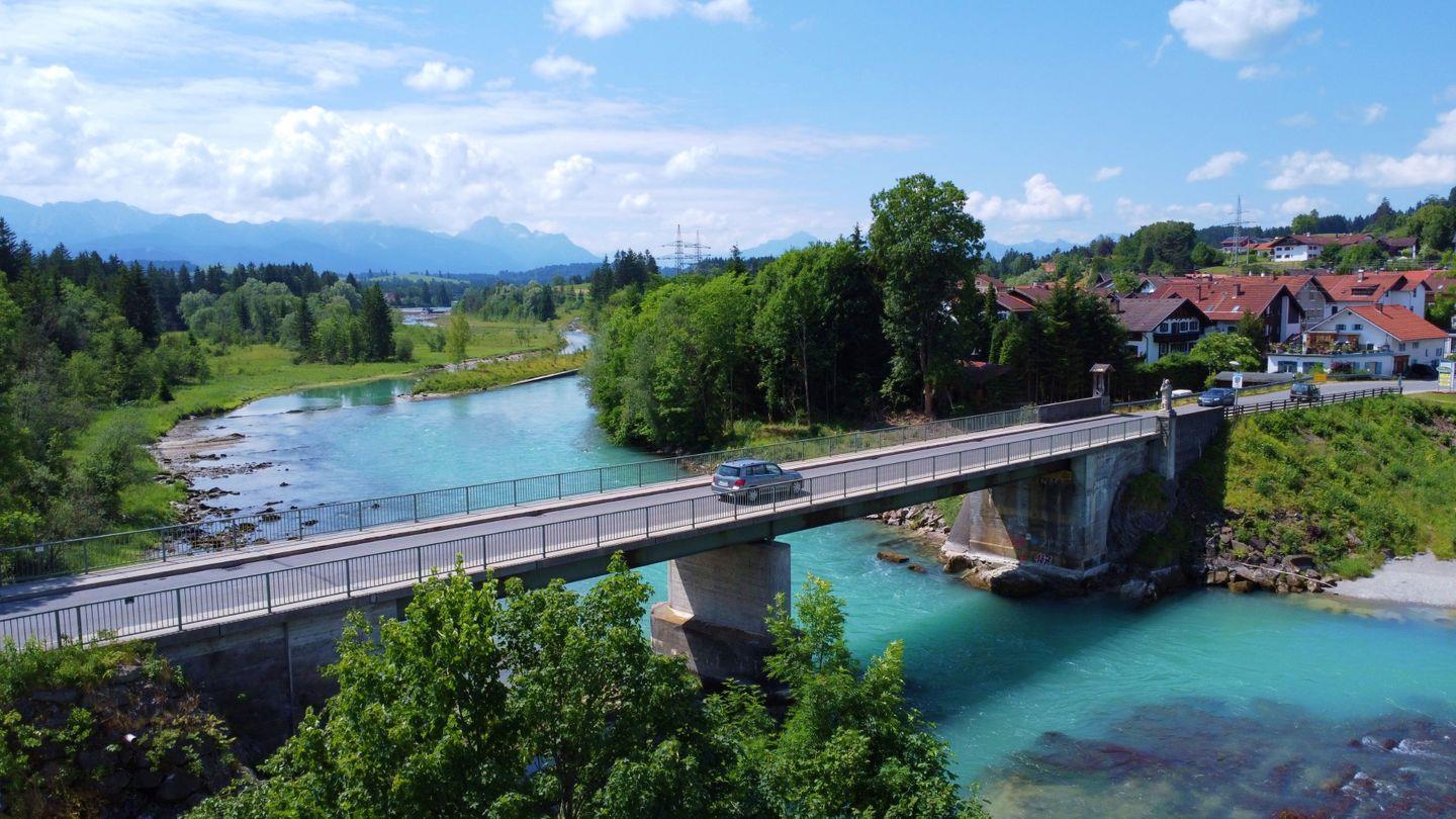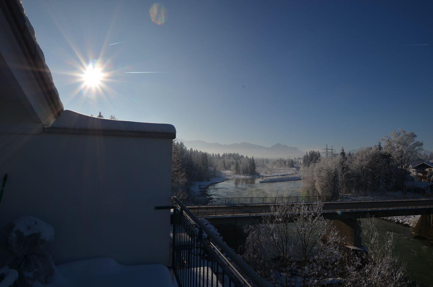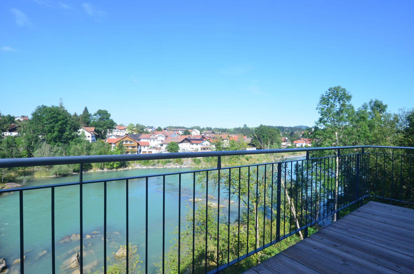 Vom Wohnbereich betreten Sie einen großen Balkon mit traumhaften Blick auf den Lech und Lechbruck am See.