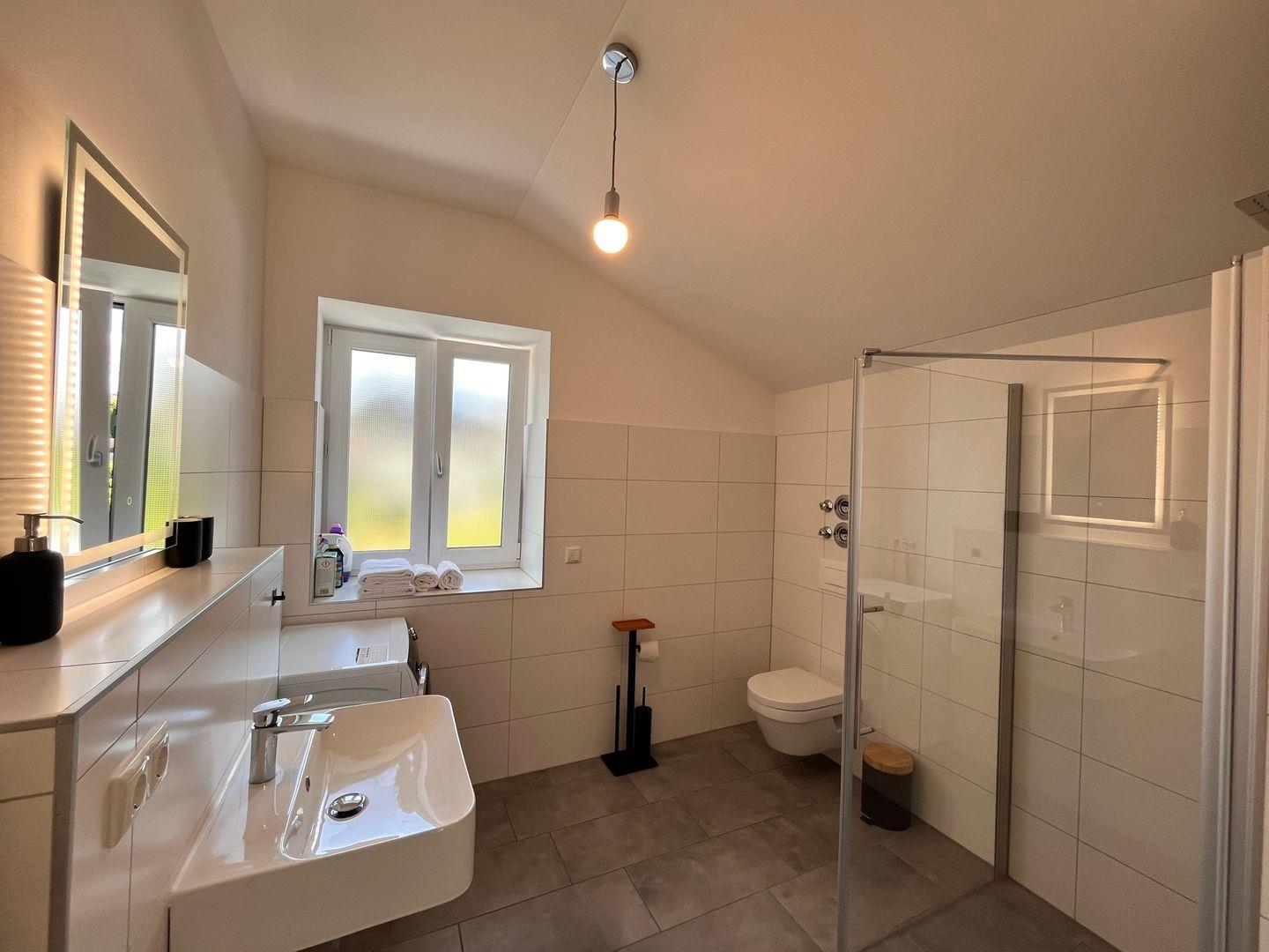 Das Badezimmer mit Fenster verfügt über eine ebenerdige Dusche, ein WC, ein Waschbecken und eine Waschmaschine. Ein Gäste WC steht Ihnen zusätzlich zur Verfügung.