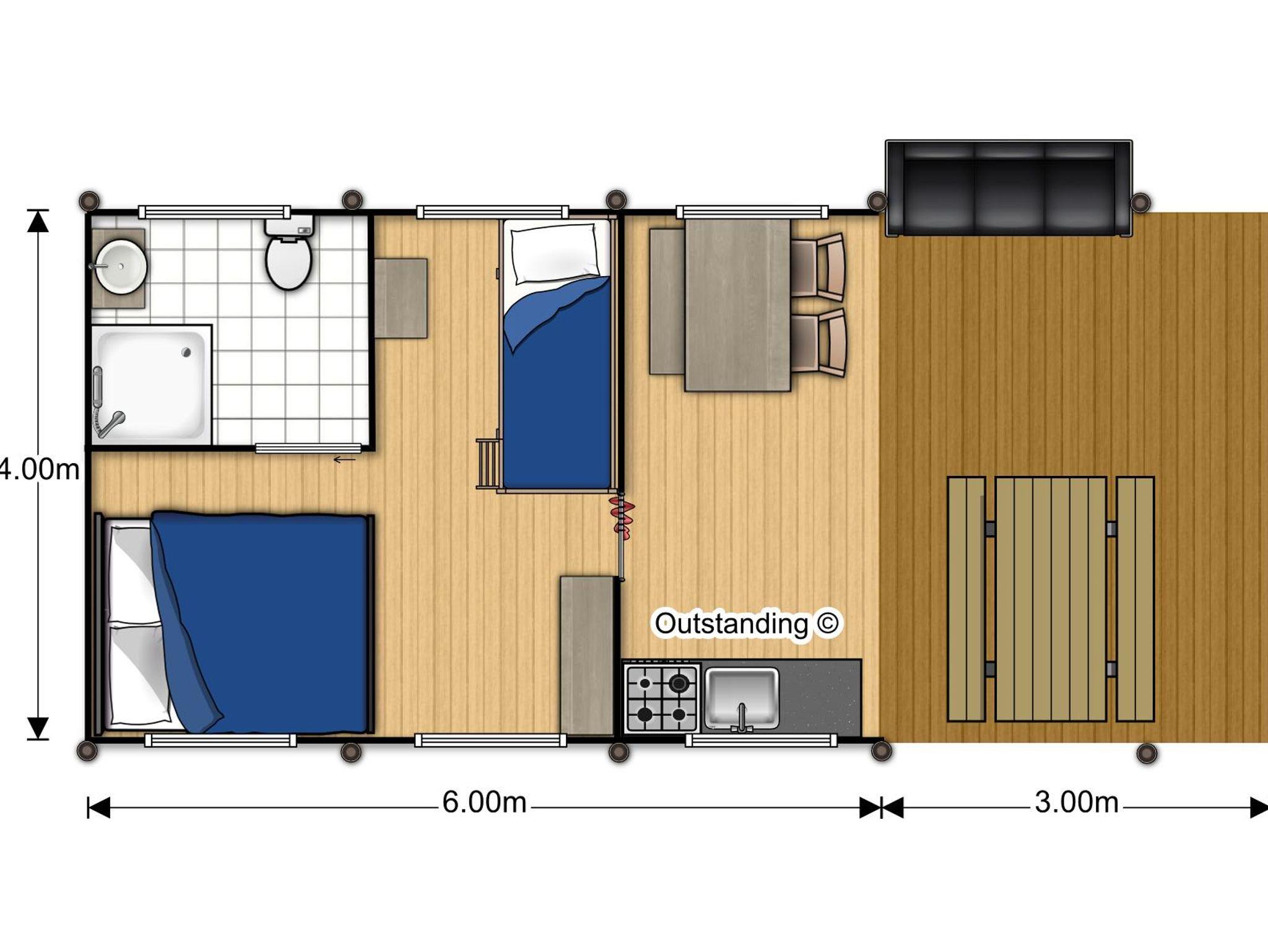 • Alle Glampingzelte wurden 2020 neu gebaut und sind wie folgt ausgestattet: Betten, Nachtschrank, Sitzecke drinnen und draußen, Kühlschrank, Toaster, Wasserkocher
