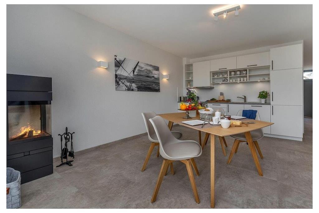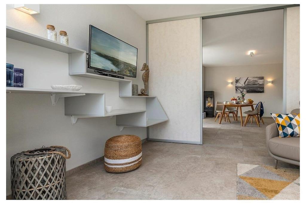 Leiligheten er 95 m² stor og tilbyr plass til hele familien. Her kan du slappe av ved peisen og bruke husets badstue etter lange turer. To terrasser er tilgjengelige utendørs: en østvendt terrasse for frokost i solen, og en sørvendt terrasse for en koselig avslutning på en flott feriedag og grilling sammen. Dette huset har en andre ferieleilighet: «Swantow». Om nødvendig kan du også feriere med din storfamilie i dette svært avslappede huset, men alle har sin egen leilighet. Soverom 1: Boksmatte (180x200 cm) med TV, stue med peis, åpen kjøkkenløsning, sovesofa med madrass (160x200 cm) og spiseplass.