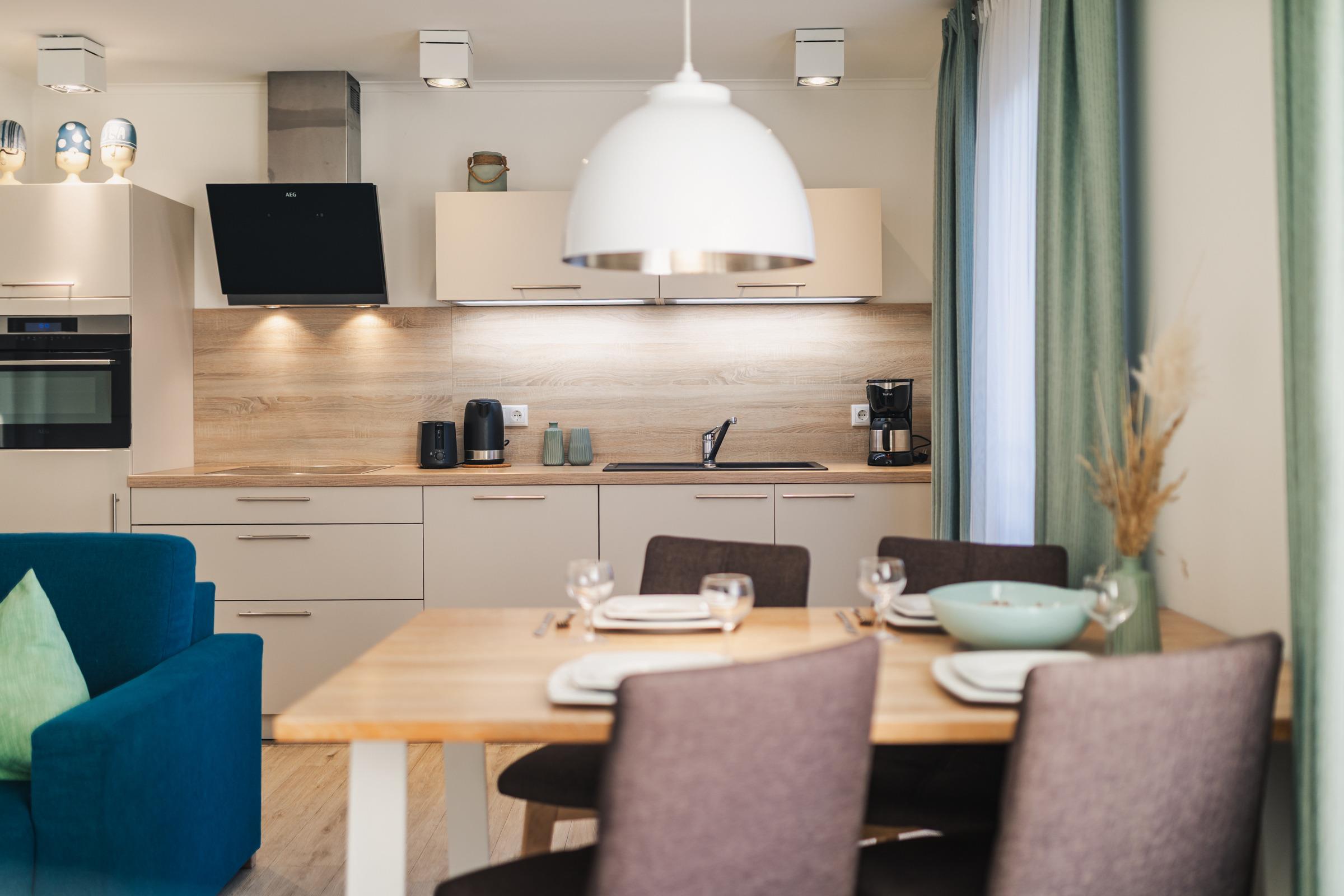 Der offene Wohn- und Essbereich mit voll ausgestatteter Küche lädt zum gemeinsamen Kochen und Verweilen ein. Zur Küchenausstattung gehören Backofen, Cerankochfeld, Geschirrspüler, Kaffeemaschine, Wasserkocher u.v.m. – perfekt für eine flexible Selbstversorgung im Urlaub.