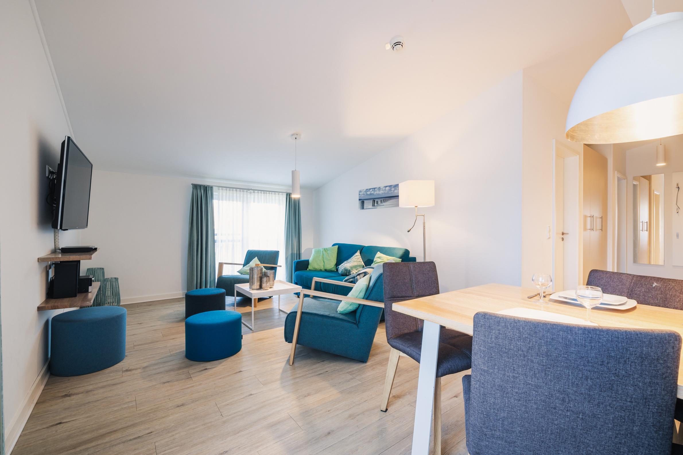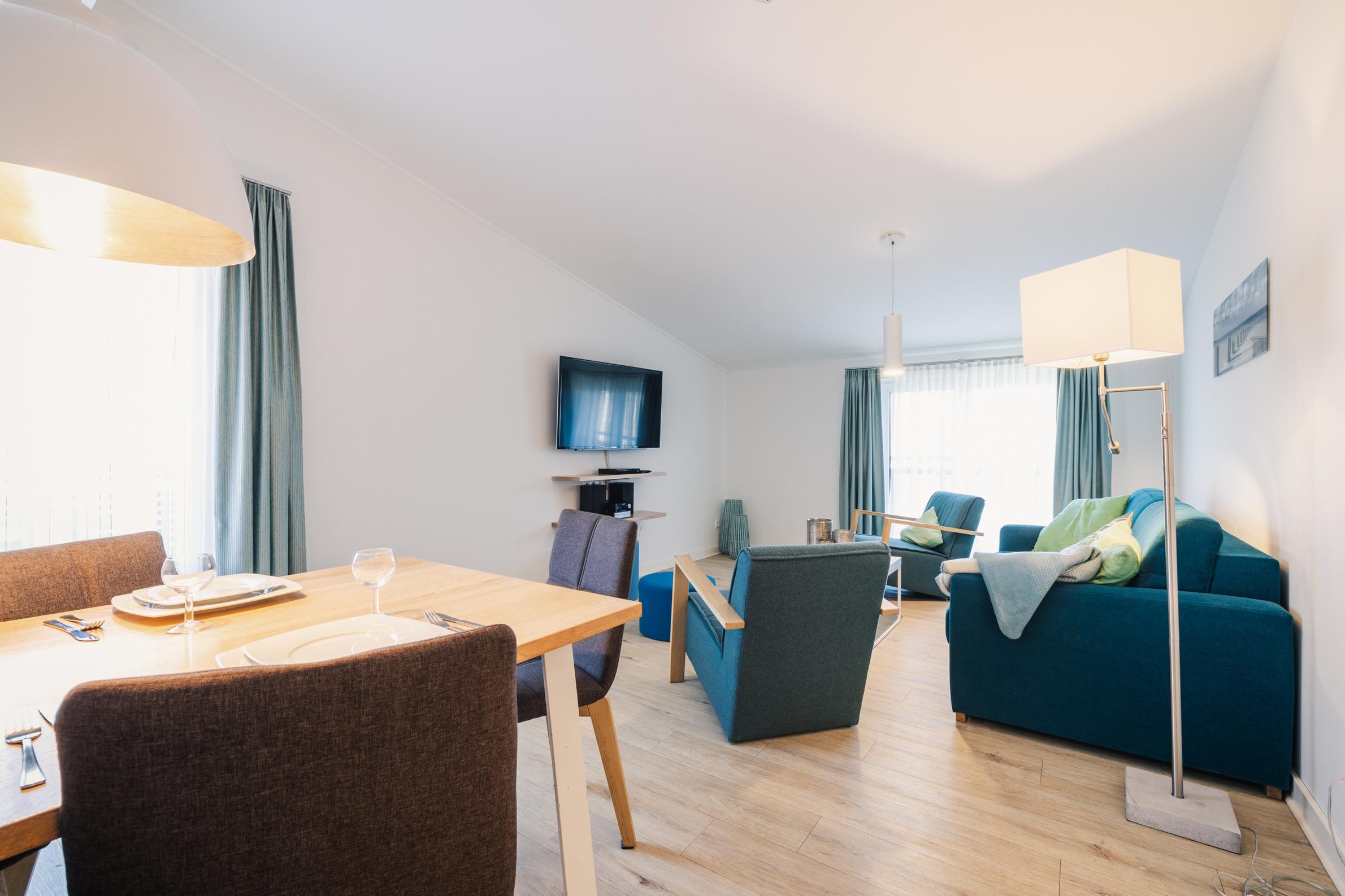 Zwei separate Schlafzimmer mit komfortablen Boxspring-Doppelbetten und TV sorgen für ruhige Nächte. Der gemütliche Wohnbereich mit großer Couch und Flat-TV lädt zum Entspannen, Lesen oder zu gemeinsamen Abenden ein.