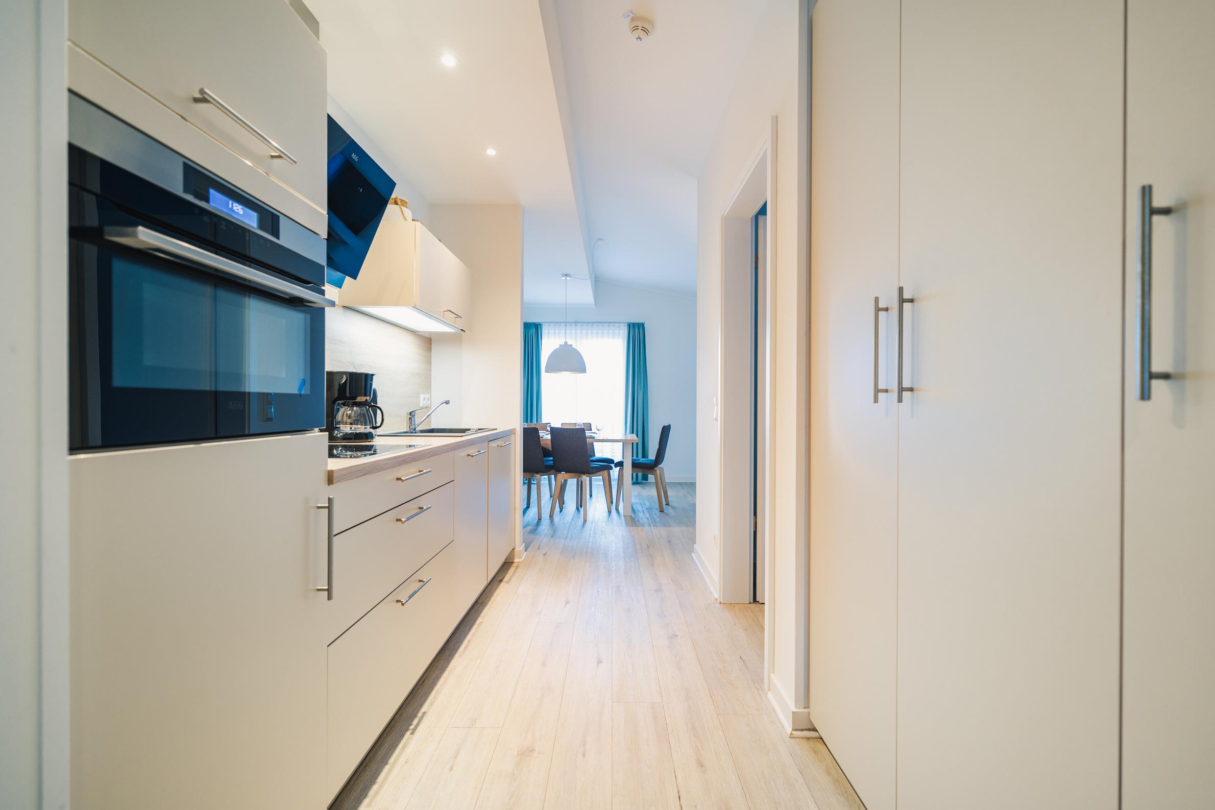 Die voll ausgestattete Küche mit Spülmaschine, Backofen, Cerankochfeld und Kaffeemaschine, Toaster uvm macht die Selbstversorgung im Urlaub angenehm und unkompliziert. Ein schöner Ort im Freien ist der Balkon, ideal für ein entspanntes Frühstück oder ruhige Abendstunden an der frischen Ostseeluft.
