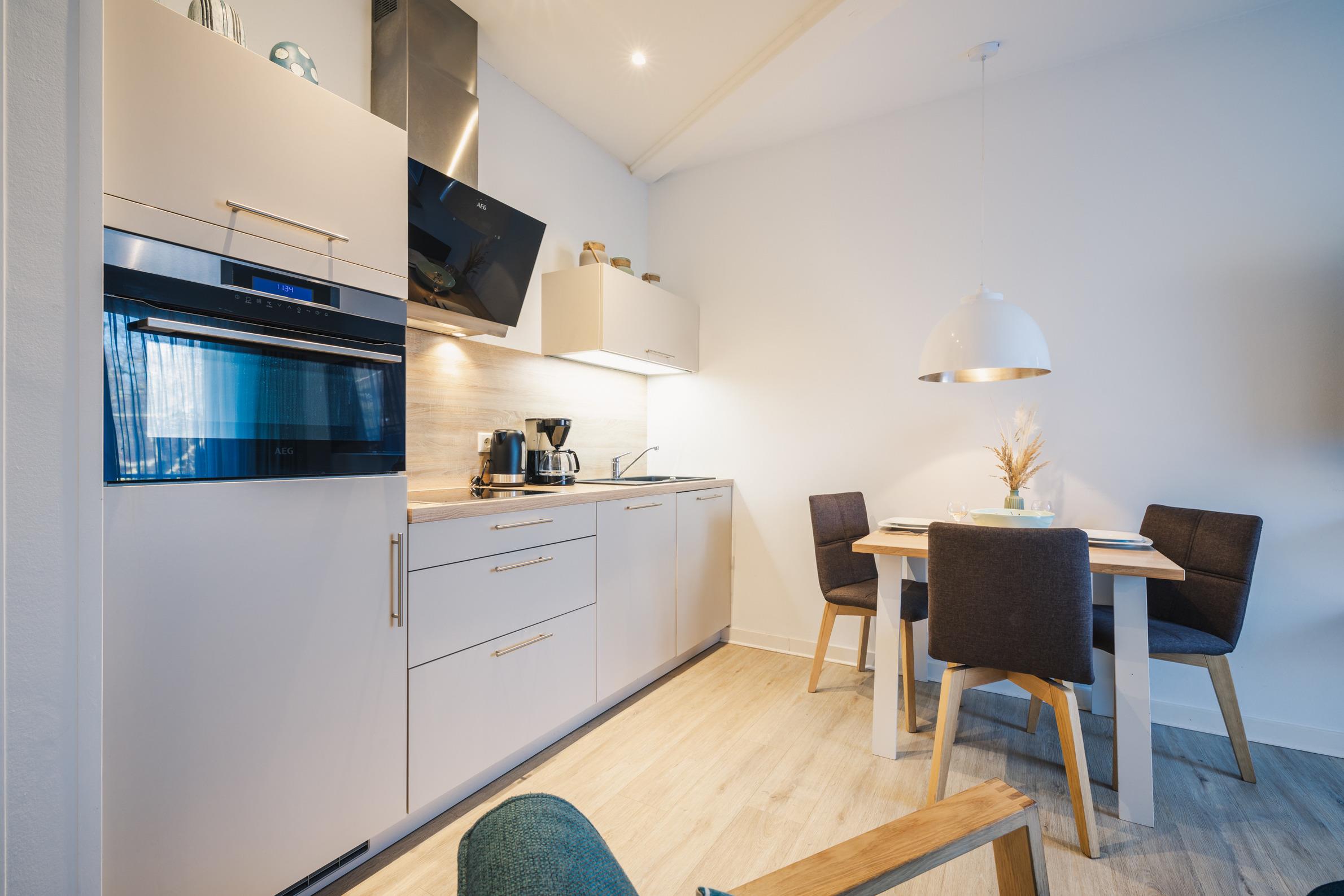 Die voll ausgestattete Küche verfügt über Backofen, Cerankochfeld, Geschirrspüler, Kaffeemaschine, Wasserkocher, Toaster u.v.m. und ermöglicht eine flexible Selbstversorgung im Urlaub. Das moderne Badezimmer mit ebenerdiger Dusche rundet das komfortable Gesamtbild ab.