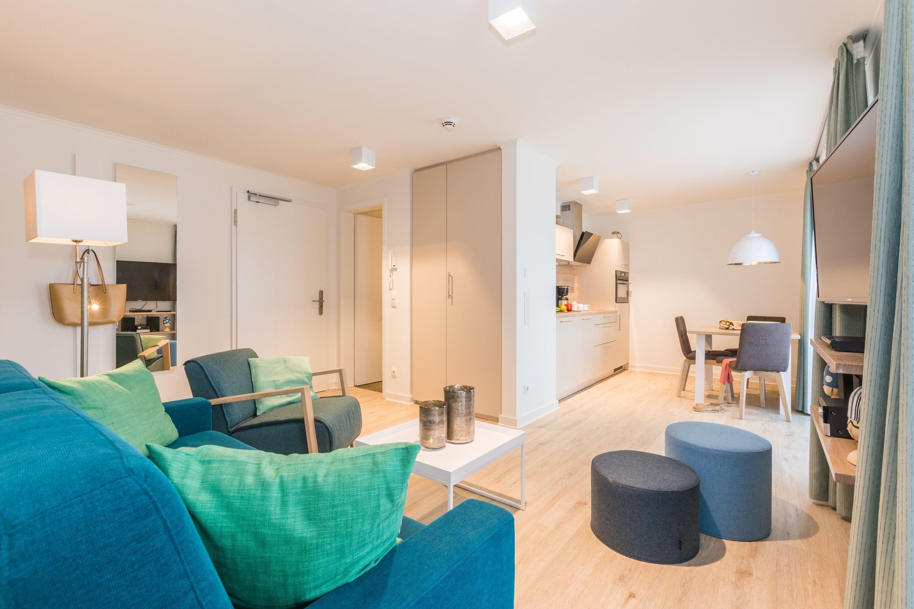 Auf 40 m² erwartet Sie ein modernes, maritimes Ambiente, das Leichtigkeit und Wärme ausstrahlt. Der offene Wohn- und Schlafbereich mit komfortablem Boxspring-Doppelbett lädt zu entspannten Abenden ein – vielleicht mit einem Film, einem guten Buch oder einfach einem Glas Wein nach einem langen Strandspaziergang.