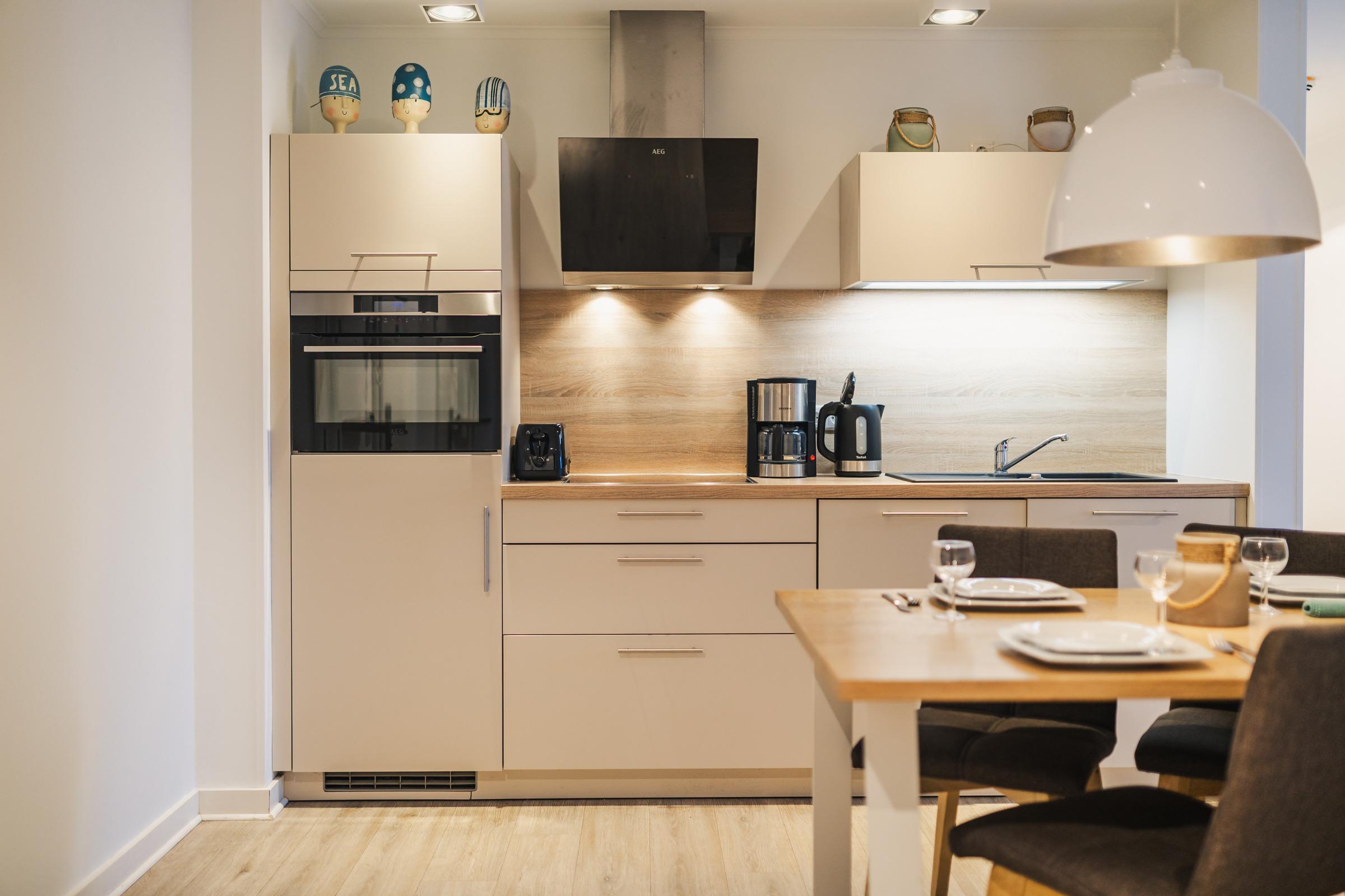 Die voll ausgestattete, offene Küche lässt keine Wünsche offen – mit hochwertigen Geräten wie Backofen, Cerankochfeld, Geschirrspüler und Kaffeemaschine wird Kochen auch im Urlaub zum Vergnügen.