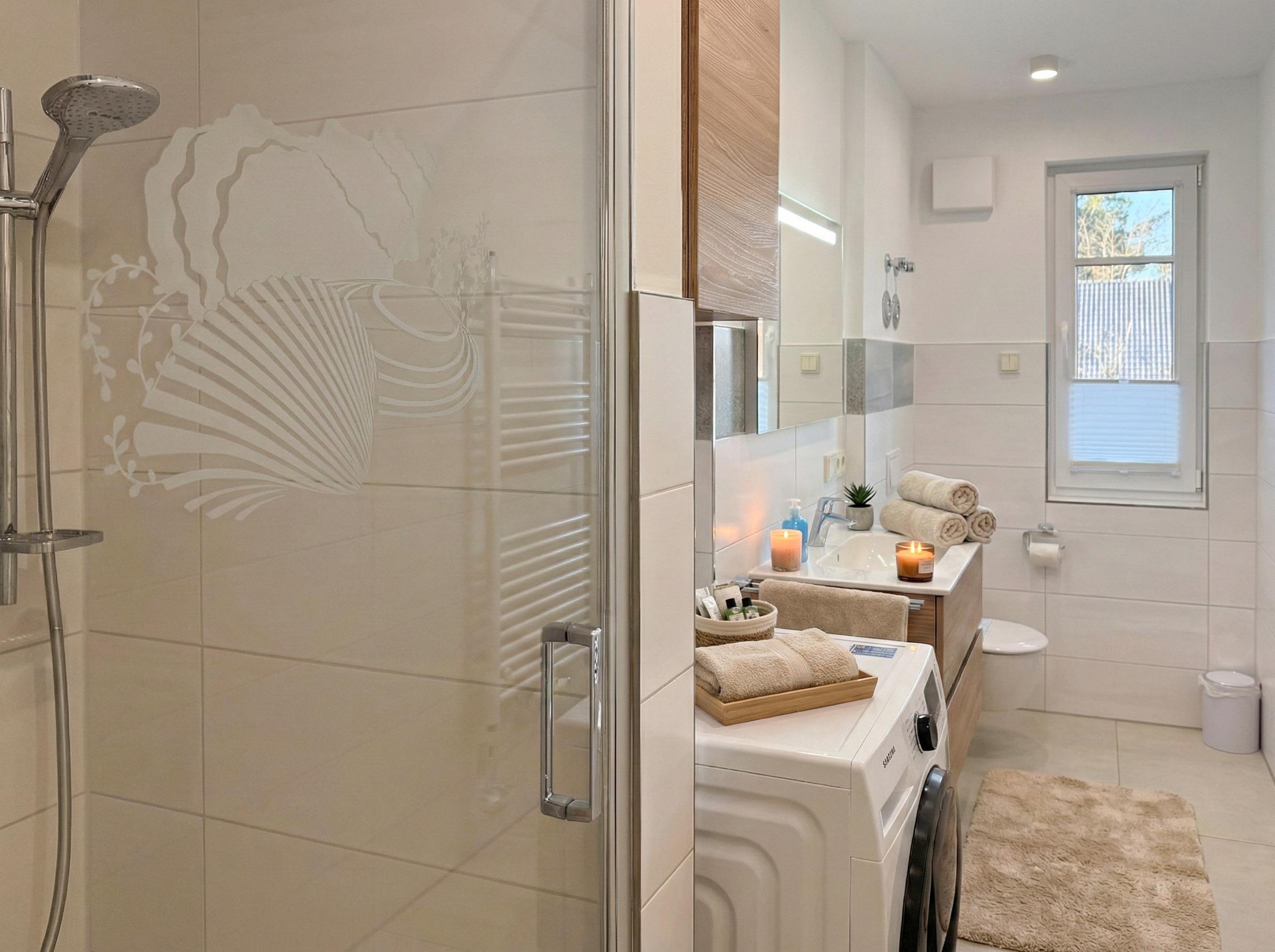 Modernes Badezimmer: Edles Design mit bodengleicher Dusche und einer praktischen Waschmaschine für Ihre Urlaubsgarderobe.