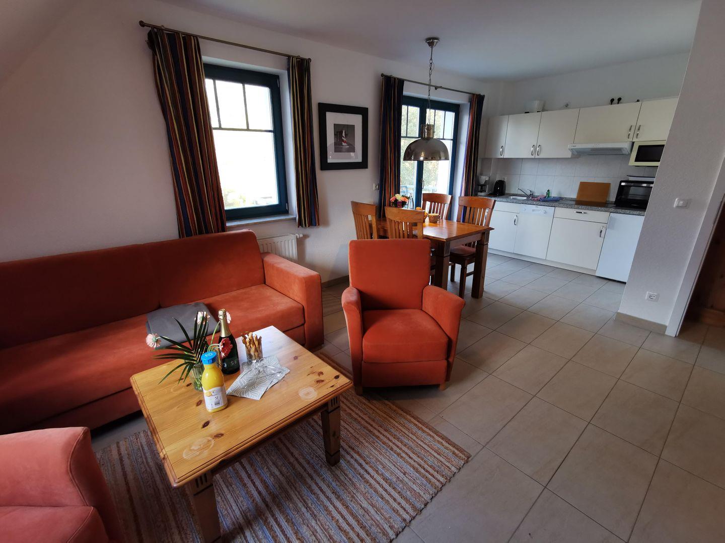 Die offene Küche ist modern ausgestattet und lädt dazu ein, gemeinsam zu kochen und zu speisen. Der Wohnbereich überzeugt mit einem komfortablen Sofa. Zwei Sessel bieten weitere Sitzgelegenheiten für gemütliche Stunden.