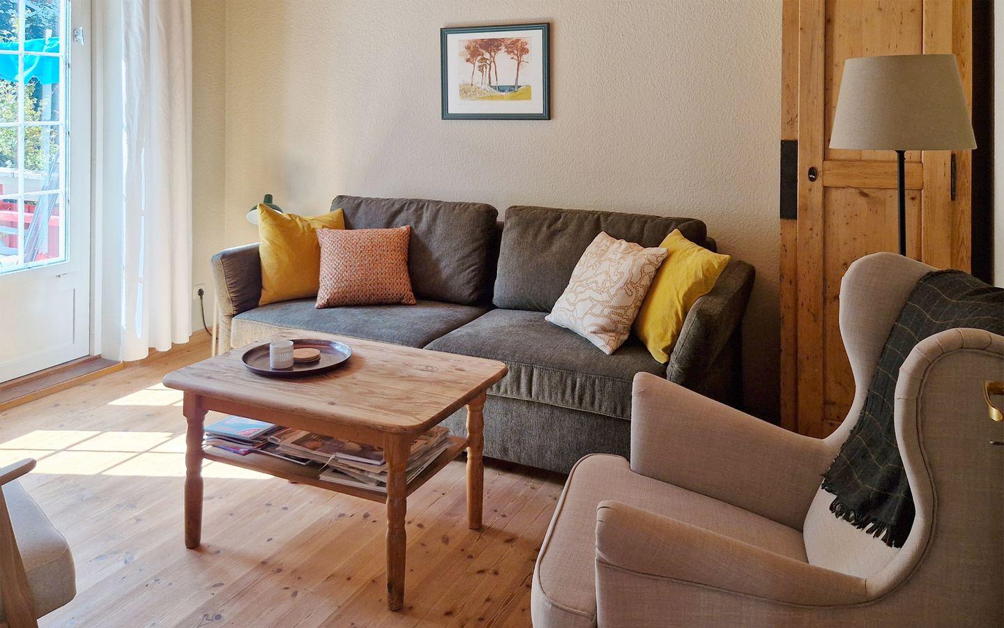 Ferienhaushälfte bis 6 Personen | ca. 62 m² Wohnfläche | EG Wohnzimmer, Küche mit Küchenzeile und Essbereich, Leseecke, Bad | OG 2 Schlafzimmer, Bad | Kaminofen | erhöhte Terrasse | 2 Parkplätze | Wohnzimmer Schlafsofa und Sessel, SAT-TV | Küche Essbereich mit Kaminofen, Herd (Cerankochfeld), Backofen, Geschirrspüler, Kühlschrank mit Gefrierfach, Kaffeemaschine, Toaster, Wasserkocher, Mixer | 2 Bäder bodengleiche Dusche, WC, Waschmaschine im EG | Badewanne, WC im OG | 2 Schlafzimmer SZ1 | 1 Doppelbett (180 x 200 cm), SZ 2 | 1 Doppelbett (140x200), 1 Einzelbett (90 x 200 cm), 1 Kinderbett im OG | Schaukel, Hochstuhl, Treppenschutzgitter, WLAN