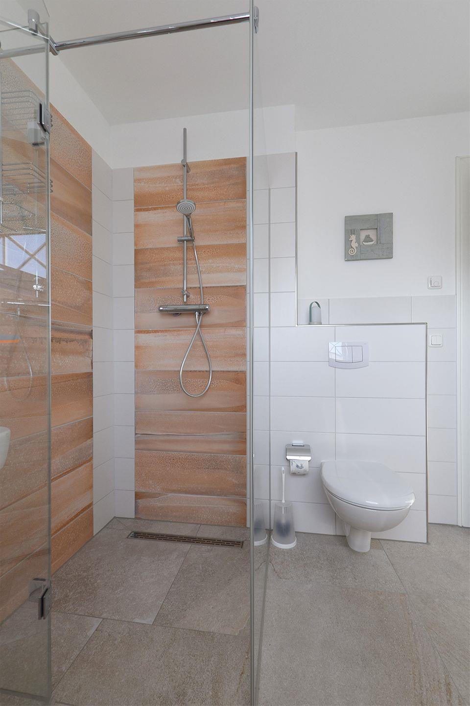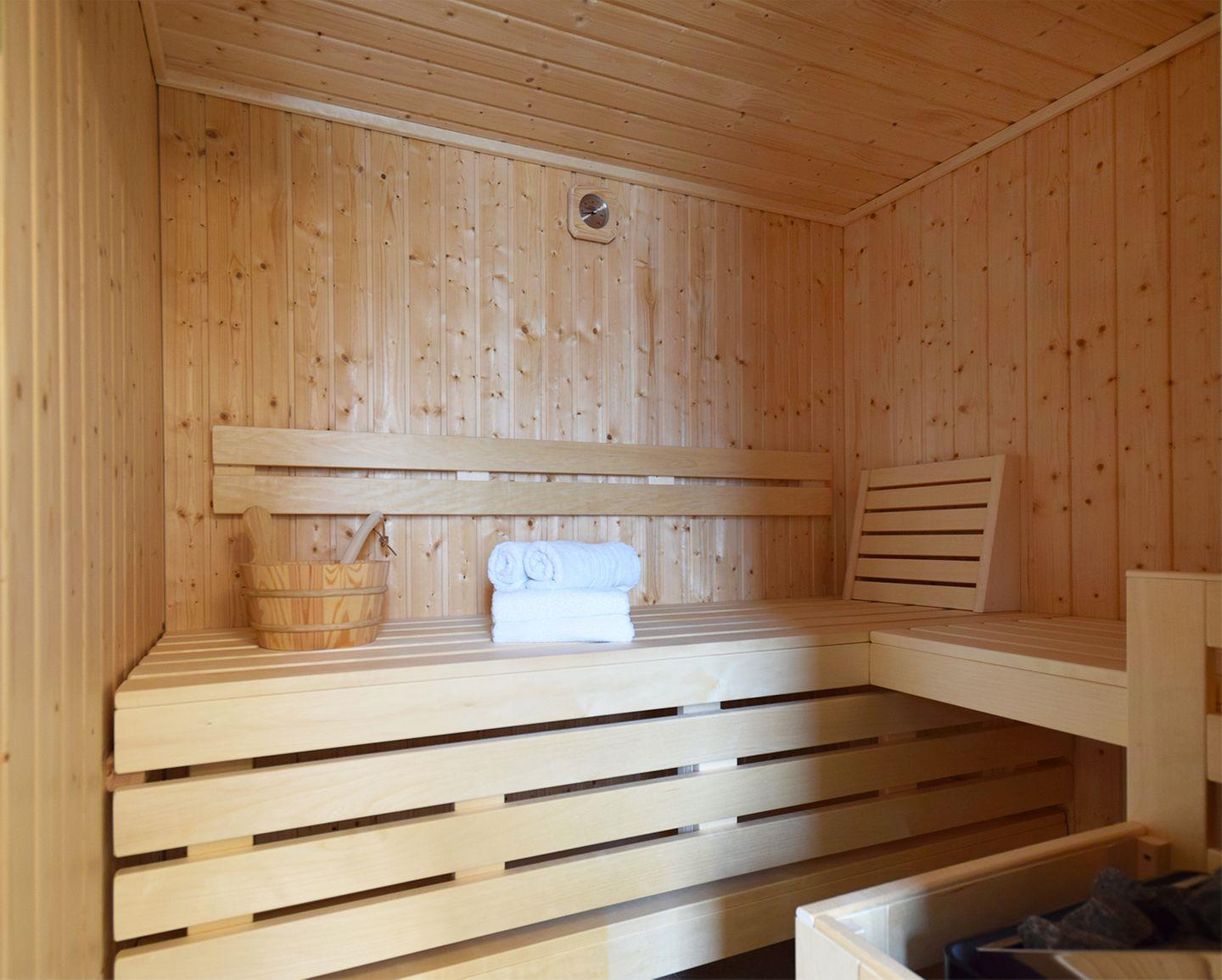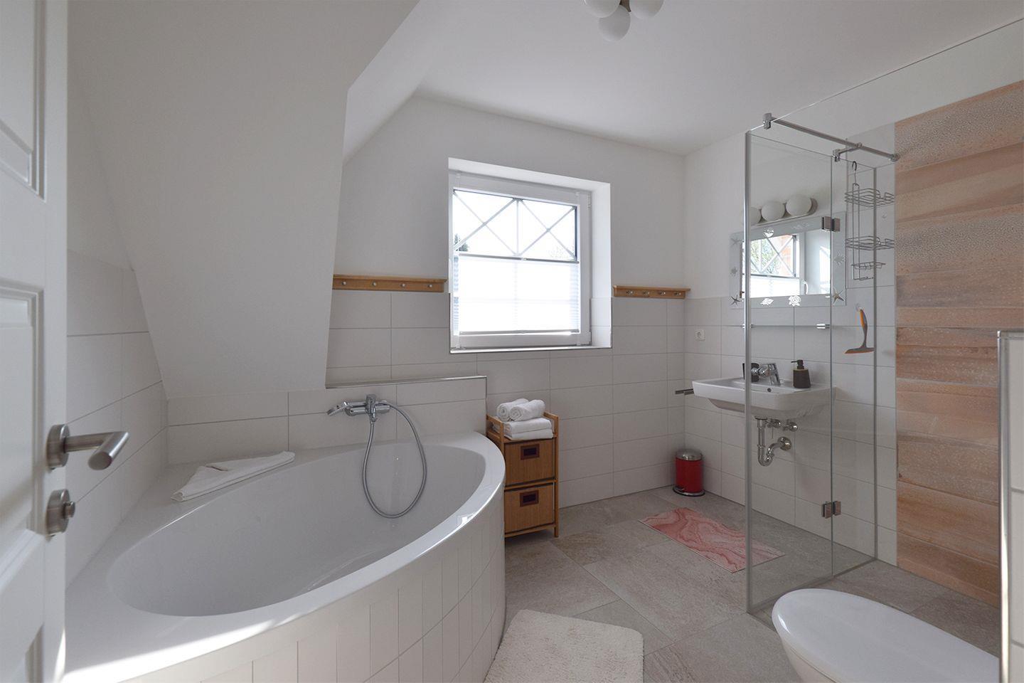 Das Haus verfügt über zwei Badezimmer. Das Bad im EG ist mit einer bodengleichen Dusche, WC, Waschbecken, Spiegel und Haartrockner ausgestattet. Für Erholung und Wellness steht eine eigene Sauna zur Verfügung. Das zweite Bad im 1. OG bietet eine Eckbadewanne und eine bodengleiche Dusche. Beide Badezimmer verfügen über warmes Wasser und sorgen mit Fenstern für angenehme Belüftung. Für weiteren Komfort sorgen außerdem eine eigene Waschmaschine sowie ein Wäscheständer.