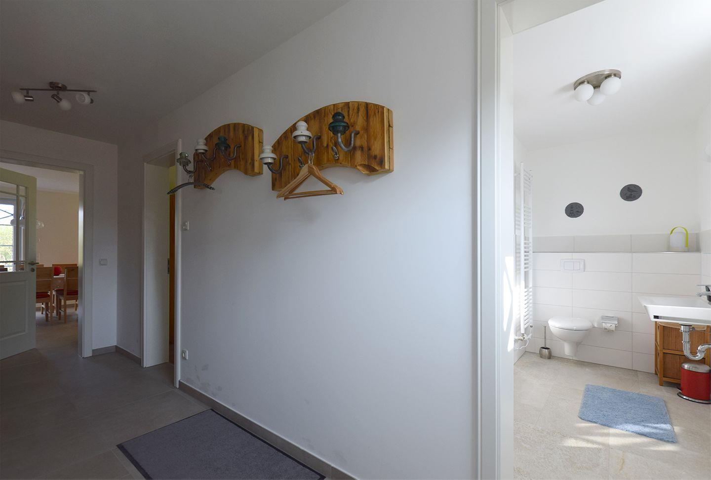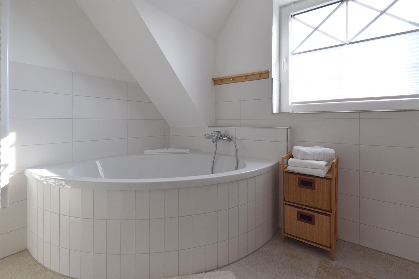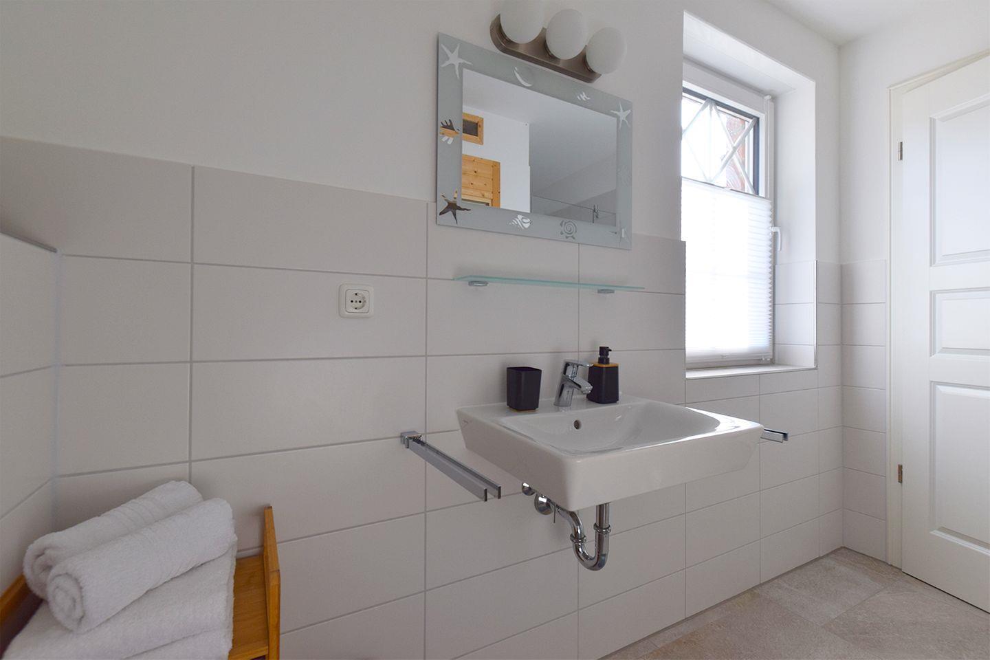Das Haus verfügt über zwei Badezimmer. Das Bad im EG ist mit einer bodengleichen Dusche, WC, Waschbecken, Spiegel und Haartrockner ausgestattet. Für Erholung und Wellness steht eine eigene Sauna zur Verfügung. Das zweite Bad im 1. OG bietet eine Eckbadewanne und eine bodengleiche Dusche. Beide Badezimmer verfügen über warmes Wasser und sorgen mit Fenstern für angenehme Belüftung. Für weiteren Komfort sorgen außerdem eine eigene Waschmaschine sowie ein Wäscheständer.