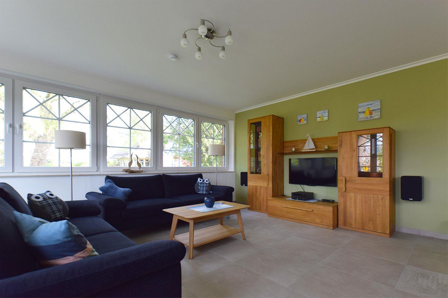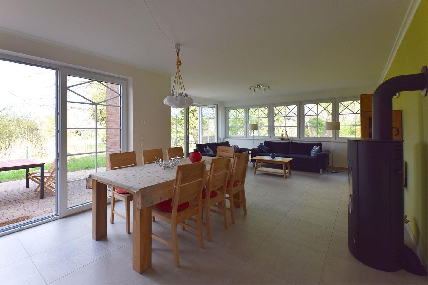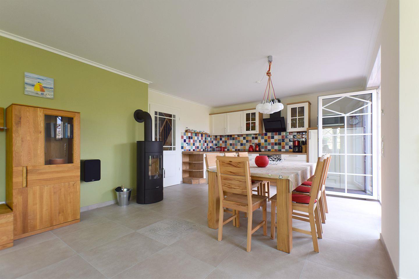 Das im Jahr 2025 fertig gestellte Haus bietet auf 110 m² Wohnfläche ausreichend Platz für bis zu sieben Personen und ist damit ideal für Familien oder Gruppen, die gemeinsam einen komfortablen Urlaub verbringen möchten. Die Unterkunft erstreckt sich über zwei Etagen, wobei sich die Hauptebene auf dem Parterre befindet. Insgesamt verfügt das Haus über fünf Zimmer, darunter vier Schlafzimmer mit Laminatboden. Das Wohnzimmer hingegen ist mit Fliesenboden ausgestattet und lädt durch eine gemütliche Sofaecke sowie einen Kaminofen zu entspannten Stunden ein. Durch die Fußbodenheizung im gesamten Haus ist für eine angenehme Wärme gesorgt.