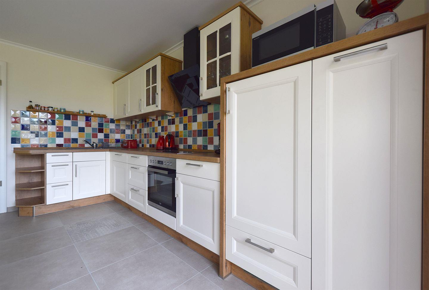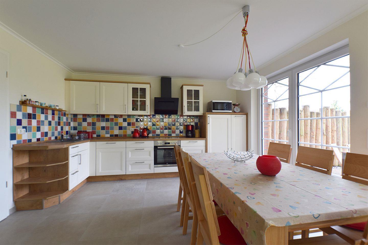 Die offene Küche ist modern und umfassend ausgestattet. Hier finden Sie neben einem Cerankochfeld und einem Elektrobackofen auch eine Mikrowelle, einen Kühlschrank inklusive Gefrierfach, eine Geschirrspülmaschine sowie weitere Küchengeräte wie Wasserkocher, Toaster und Kaffeemaschine. Ausreichend Geschirr und Besteck sind vorhanden, sodass Sie Ihre Mahlzeiten komfortabel zubereiten und genießen können. Direkt angrenzend befindet sich der Essbereich mit einem Esstisch, der sich für gemeinsame Mahlzeiten anbietet.