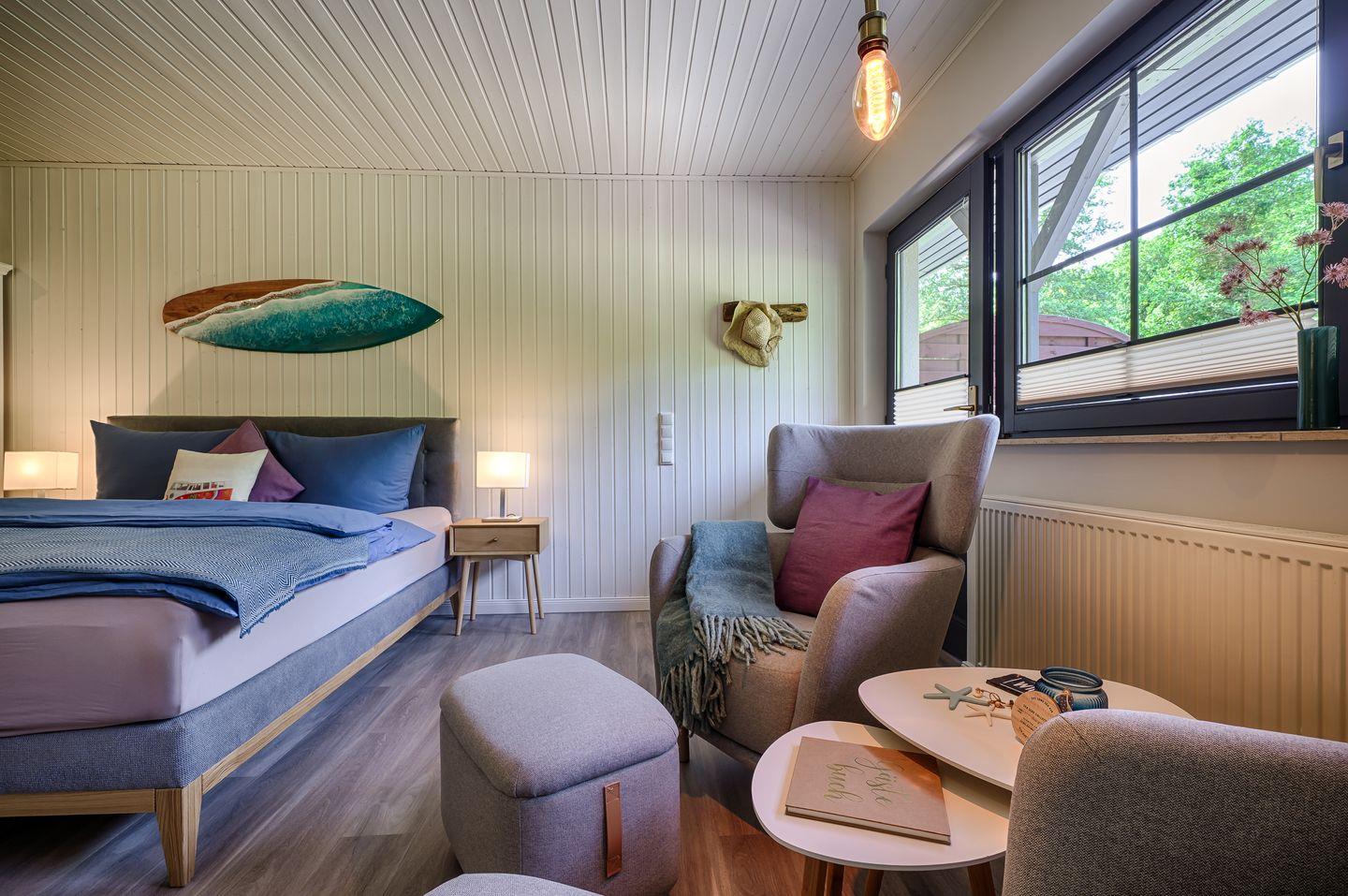 kombinierter Wohn- und Schlafraum mit Doppelbett (1,80x2,00m) und Sitzecke