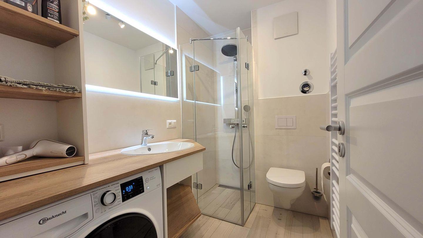 Das modern eingerichtete Badezimmer ist mit einer hochwertigen Dusche ausgestattet.