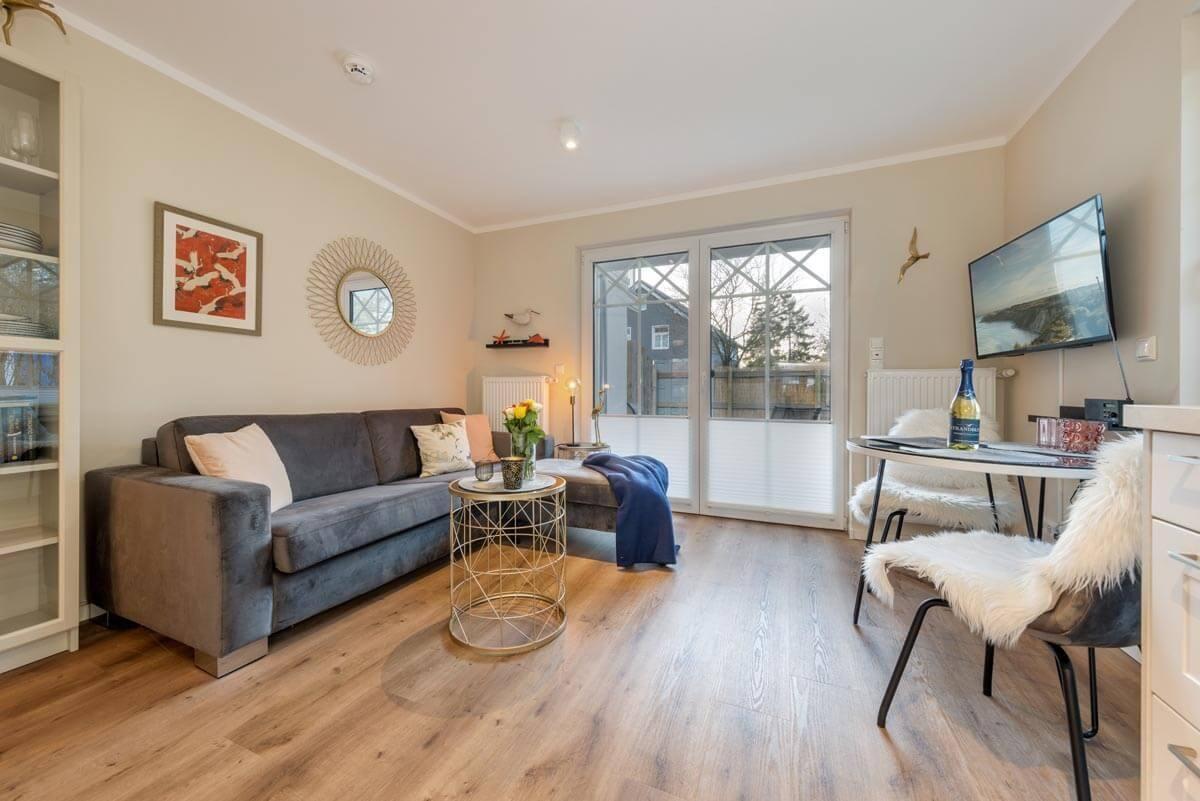 Die Ferienwohnung Kleine Krabbe in Prerow bietet auf 45qm den Komfort, den Sie für einen erholsamen Urlaub benötigen. Die Wohnung liegt im Erdgeschoss und hat eine kleine Terrasse mit Garten.