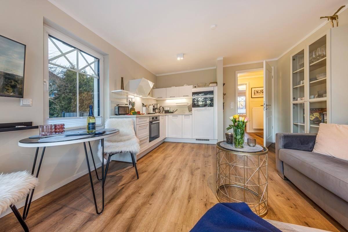 In dem gemütlichen Wohnzimmer befindet sich ein offener Küchenbereich. Die Küche ist mit allen wichtigen Geräten von Miele ausgestattet und bietet Platz zum Kochen und Essen. Das Schlafzimmer mit seinem Boxspringbett ist geräumig und lädt zum Schlafen und Entspannen ein. Das Badezimmer ist modern und verfügt über eine ebenerdige Dusche. Auf der wohnungseigenen Terrasse können Sie den Strandtag ausklingen lassen und die letzten Sonnenstrahlen genießen.